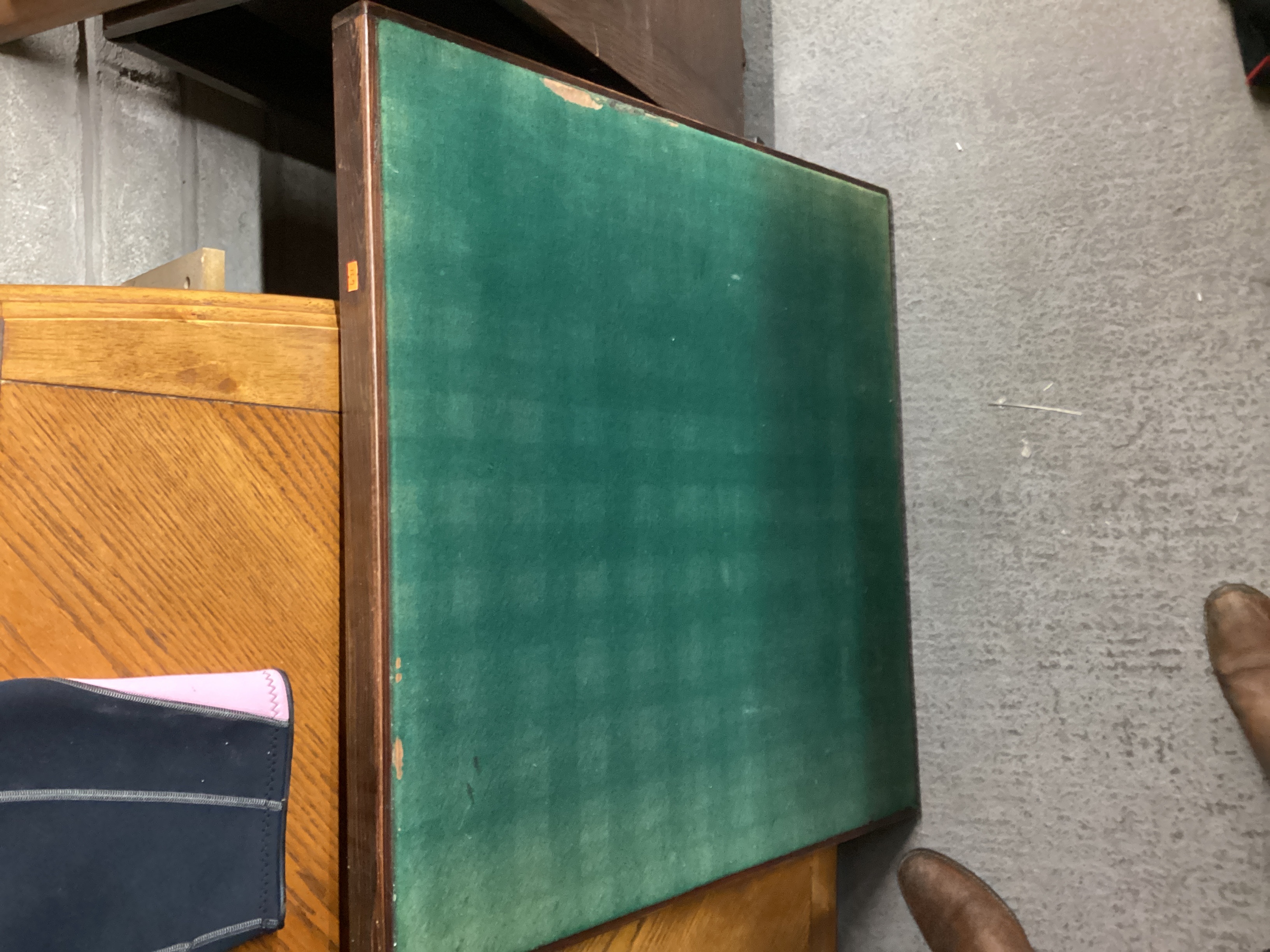 This vintage game board or table insert features a dark stained wooden frame and a deep green felt or baize playing surface. The design is simple and utilitarian. The item exhibits wear consistent with age and use, including fading, soiling, and minor tears to the felt surface. The wooden frame shows scuffs, scratches, and edge losses, especially at the corners. An orange sticker is present on the frame.
