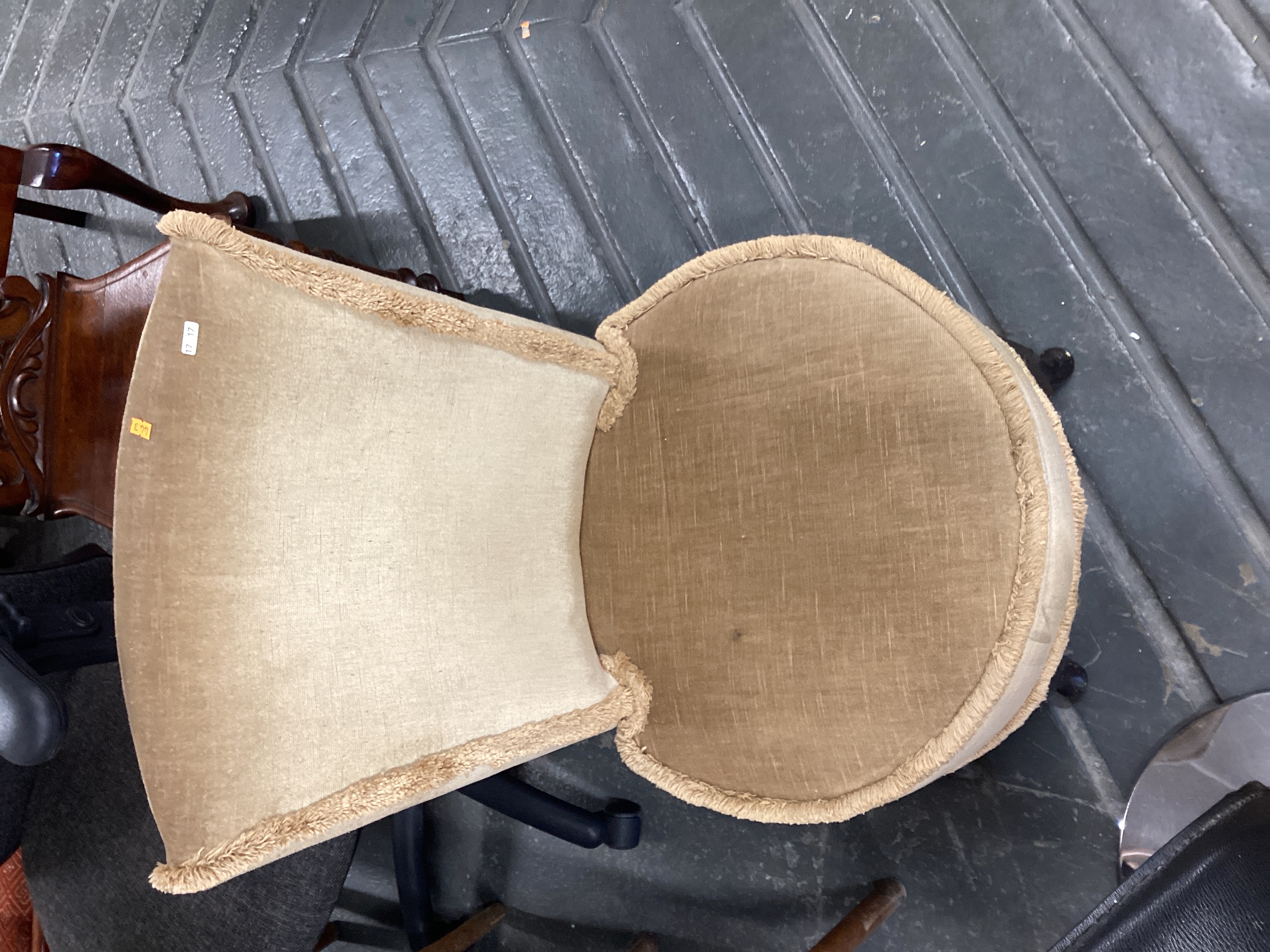 Mid-20th Century style slipper chair with a broad, fan-shaped back and circular seat. Upholstered in a light brown or tan pile fabric, possibly velvet or velour. Fringed trim accents the edges of the back and seat. The chair shows some compression and light soiling to the upholstery, particularly on the seat, and minor wear to the fringe. Markings on the back include a white sticker with “17 17” and a small orange sticker with “W3”.