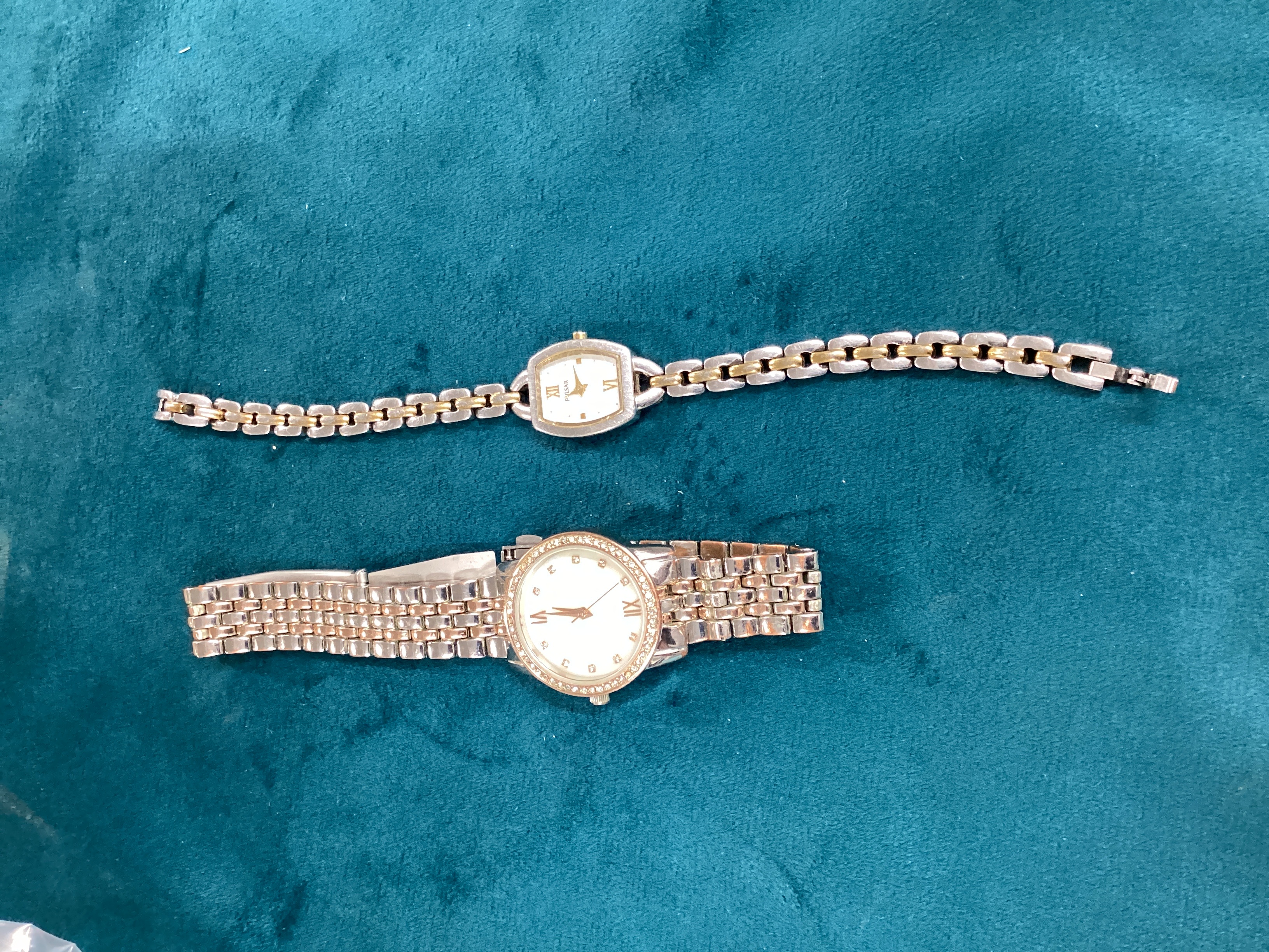 Two ladies’ fashion wristwatches. The larger watch features a round, white dial with Roman numeral hour markers at XII, III, VI, and IX, clear decorative stones accenting the bezel and remaining hour positions, and a two-tone (silver and rose gold-tone) link bracelet. The smaller watch is a Pulsar with an oval-shaped white dial, Roman numerals at XII and VI, and a two-tone (silver and gold-tone) link bracelet that appears detached or broken at one end. Both watches show signs of wear.
