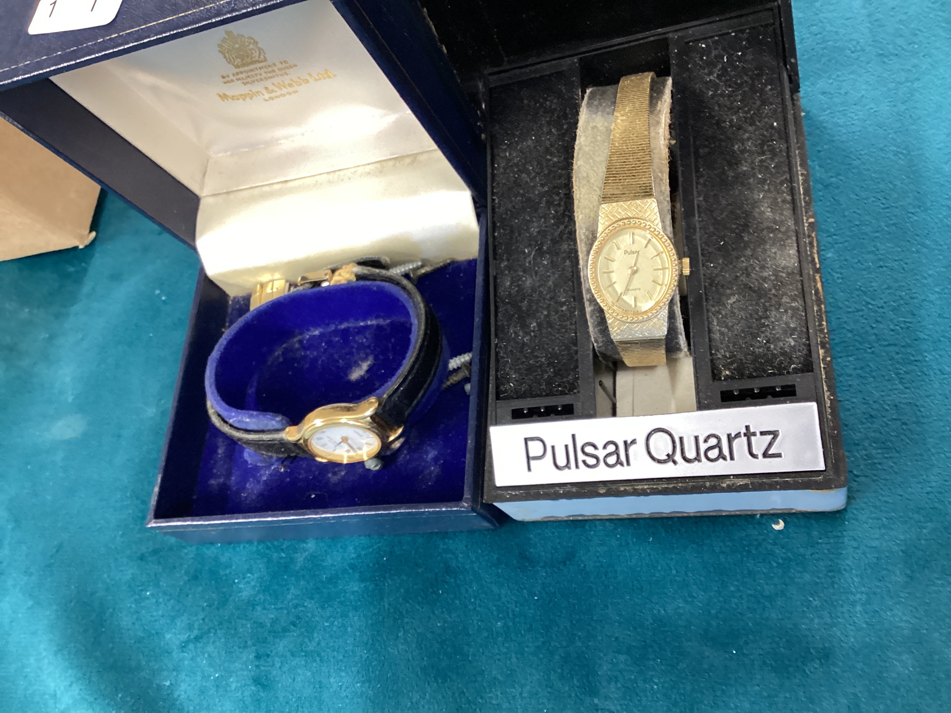 Two ladies’ wristwatches. The first is a Pulsar Quartz model with a gold-tone oval case, textured bezel, and mesh bracelet. It is housed in its original Pulsar Quartz box. The second watch has a small, round, gold-tone case, white dial, and black leather-look strap. It is contained in a navy blue Mappin & Webb Ltd London box with a royal crest inside the lid. Both watches show surface dust and minor wear consistent with age and handling.