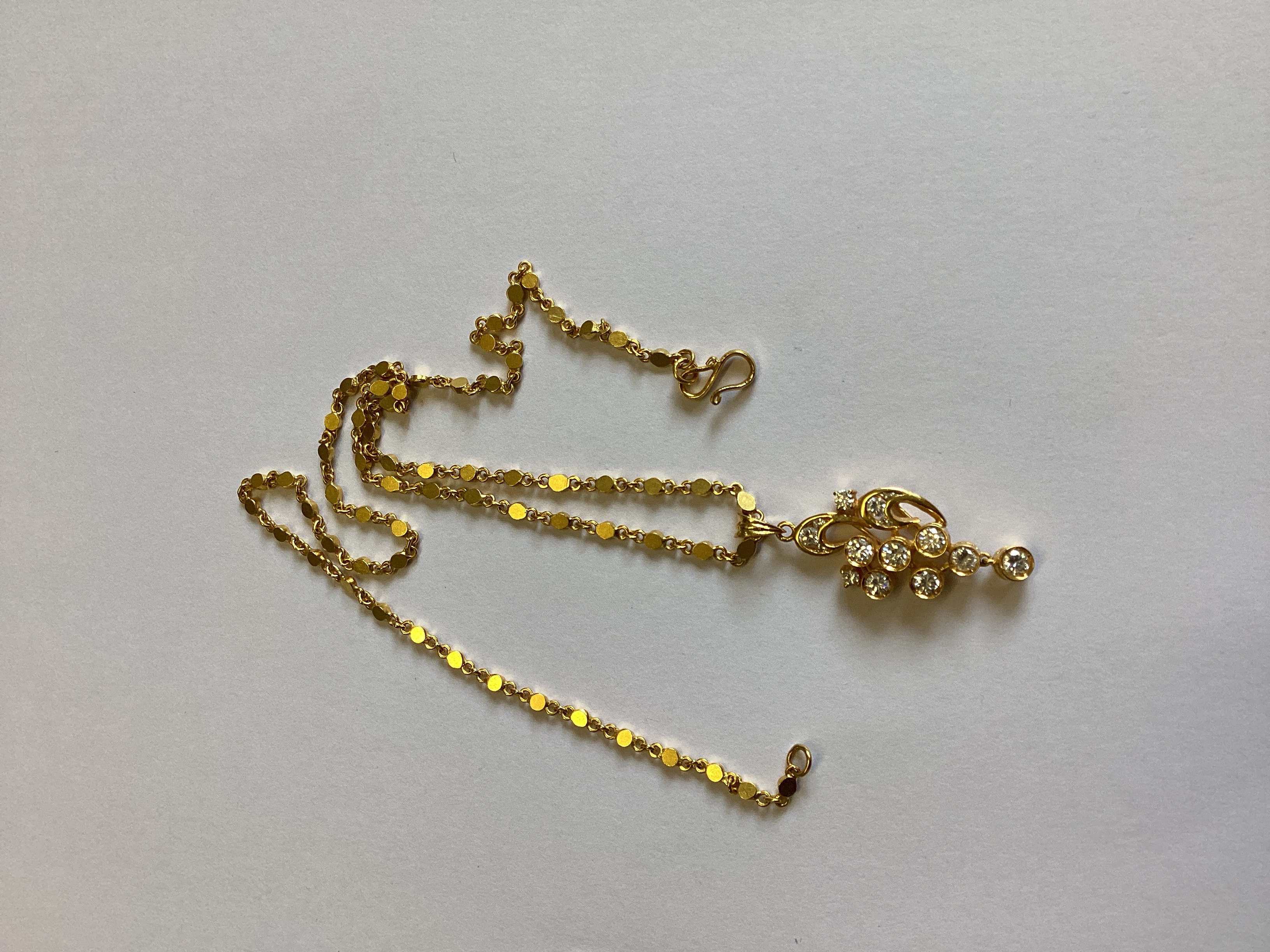 This gold tone necklace features a station-style chain composed of small, flat, disc-shaped links. The necklace is secured by an S-hook clasp. A prominent pendant hangs from the center of the chain. The pendant exhibits an ornate, scrolled design, possibly of floral or foliate inspiration. It is set with numerous clear, faceted, round brilliant-cut stones of various sizes, appearing as diamonds or simulants. No visible hallmarks or maker’s marks are present.