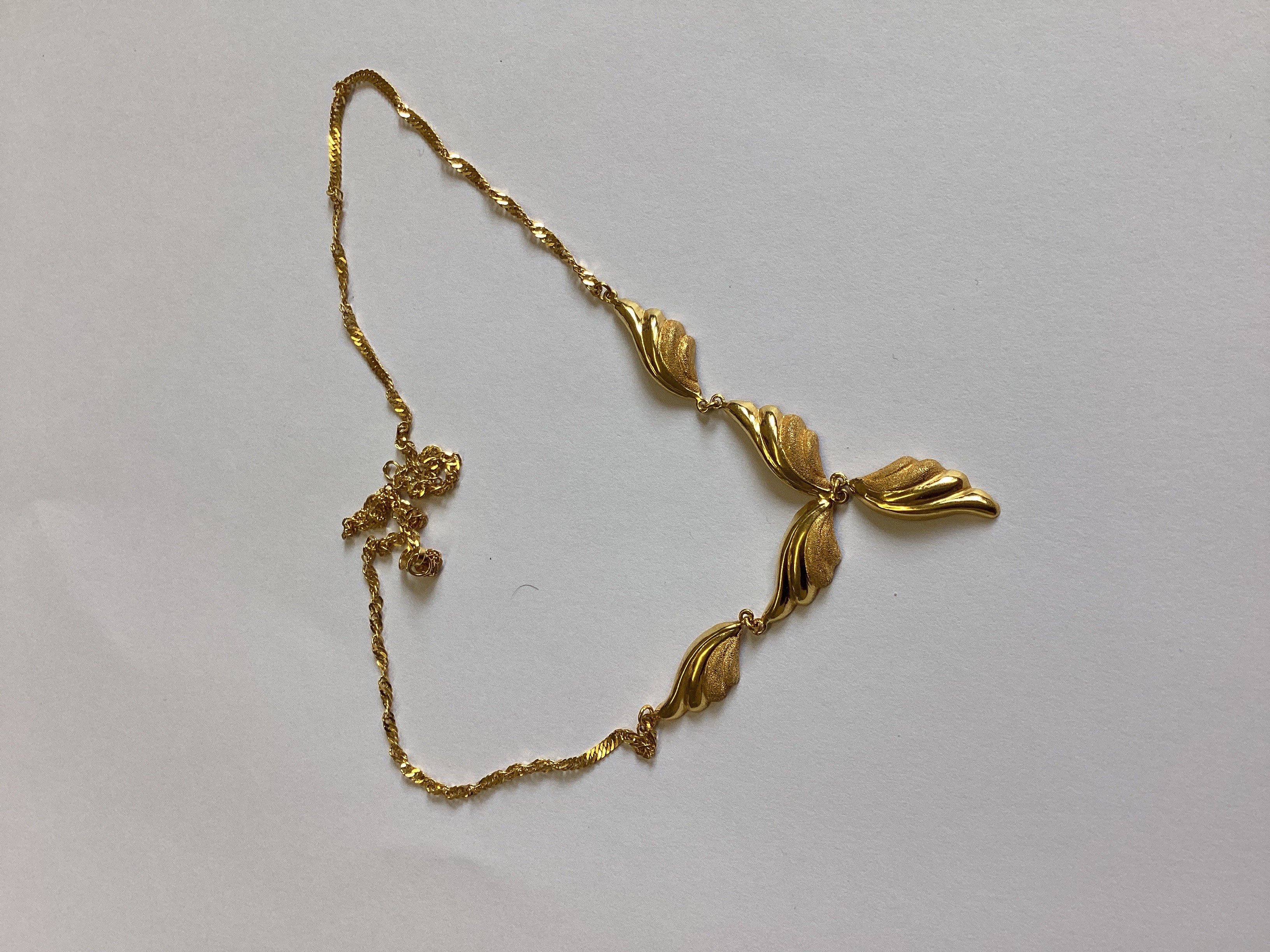 This gold-toned necklace features a twisted Singapore-style chain and five articulated, stylized leaf or wing-like elements. The central two elements and the drop pendant exhibit both polished and textured finishes. The necklace fastens with a spring-ring clasp. No visible hallmarks or maker’s marks are present.