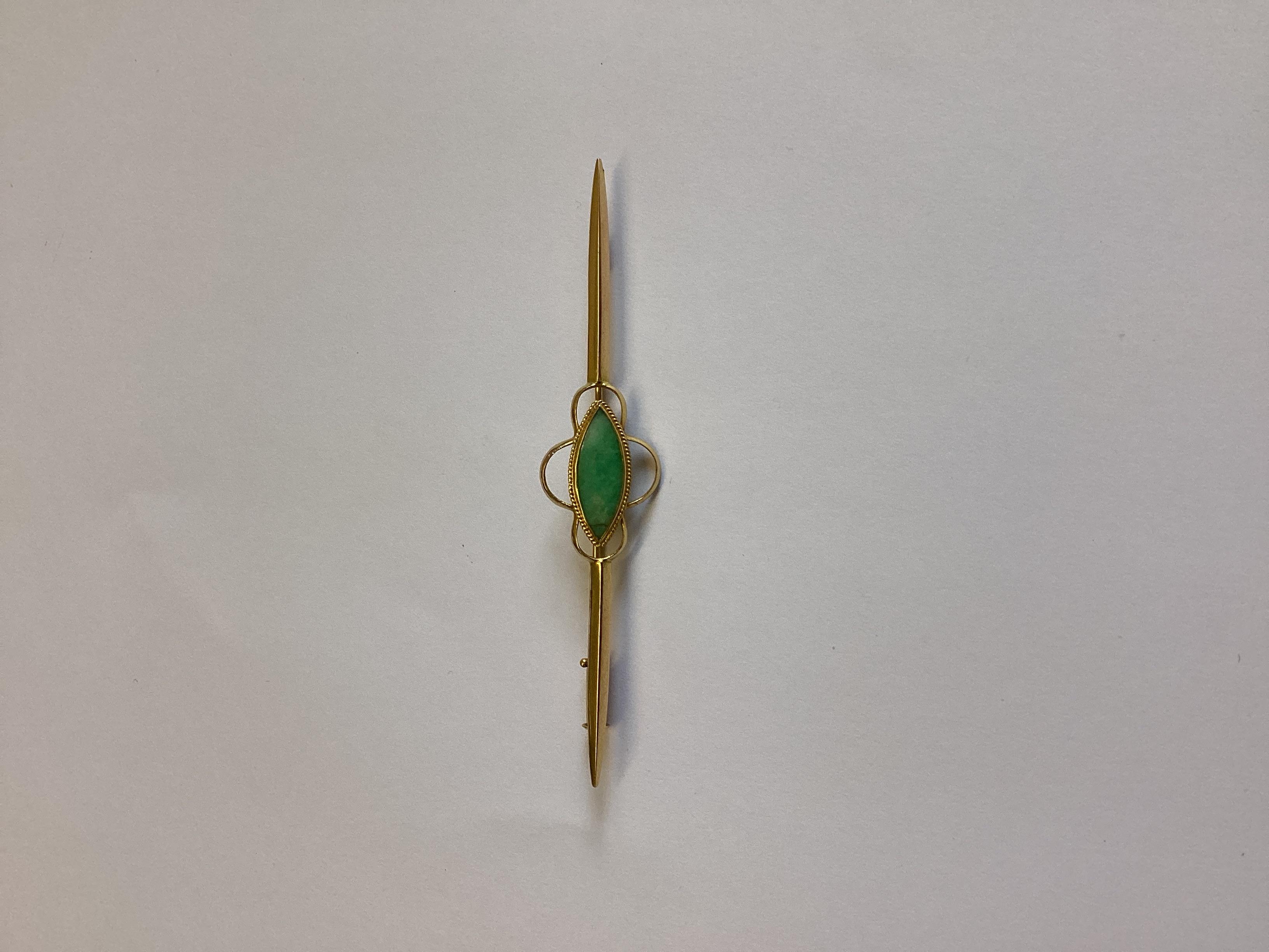 Gold bar brooch featuring a central marquise-cut green cabochon, possibly jade, bezel-set within an ornate openwork scrolled frame with beaded detailing. The brooch appears to be of Edwardian or early 20th-century origin. No discernible hallmarks or manufacturer’s marks are visible. The brooch presents in good condition commensurate with age, exhibiting minor surface wear.