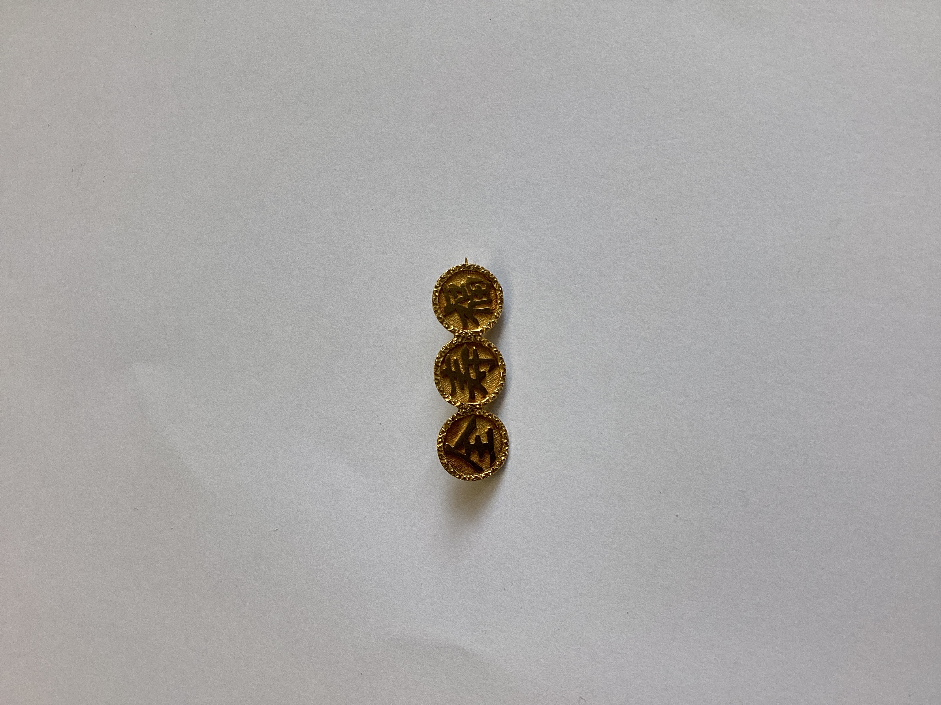 This yellow metal brooch features three interconnected circular elements. Each disc has a raised Chinese character in the center, surrounded by a textured border. From left to right, the characters are “金” (jīn – gold), “壽” (shòu – longevity), and “福” (fú – good fortune/happiness). The brooch has a pin mechanism on the reverse of the rightmost disc. It shows minor surface wear and a light patina.