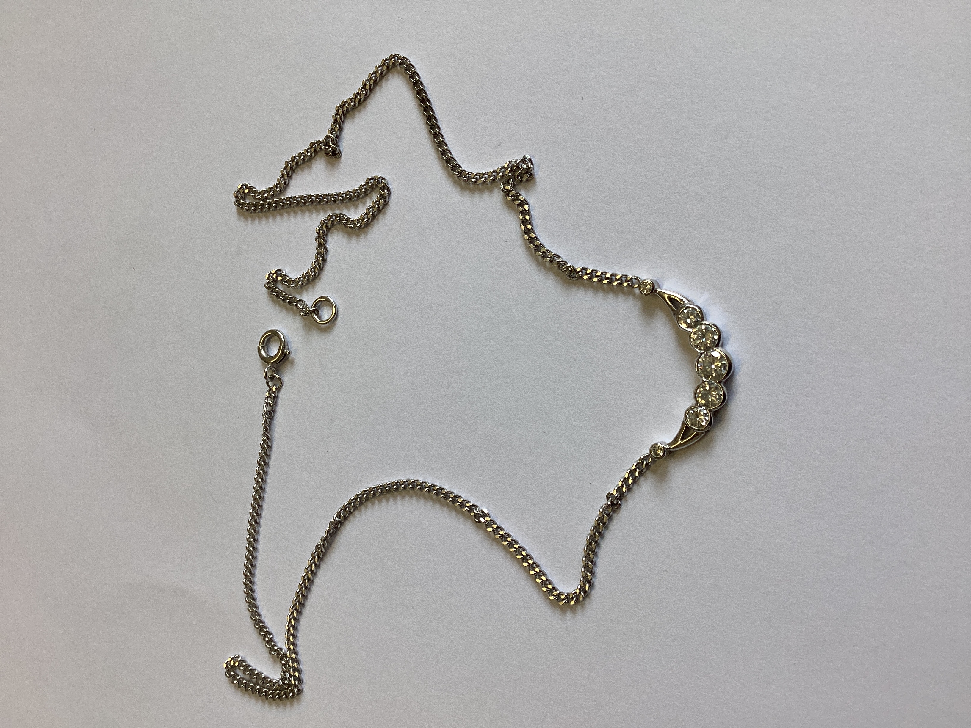 Rhinestone and silver-tone metal necklace. The necklace features a curb link chain with a spring-ring clasp. The central decorative element is a crescent-shaped bar set with five graduated, round faceted clear rhinestones. A smaller round faceted clear rhinestone flanks the crescent on each side, connecting it to the chain. The necklace shows minor surface wear consistent with use.