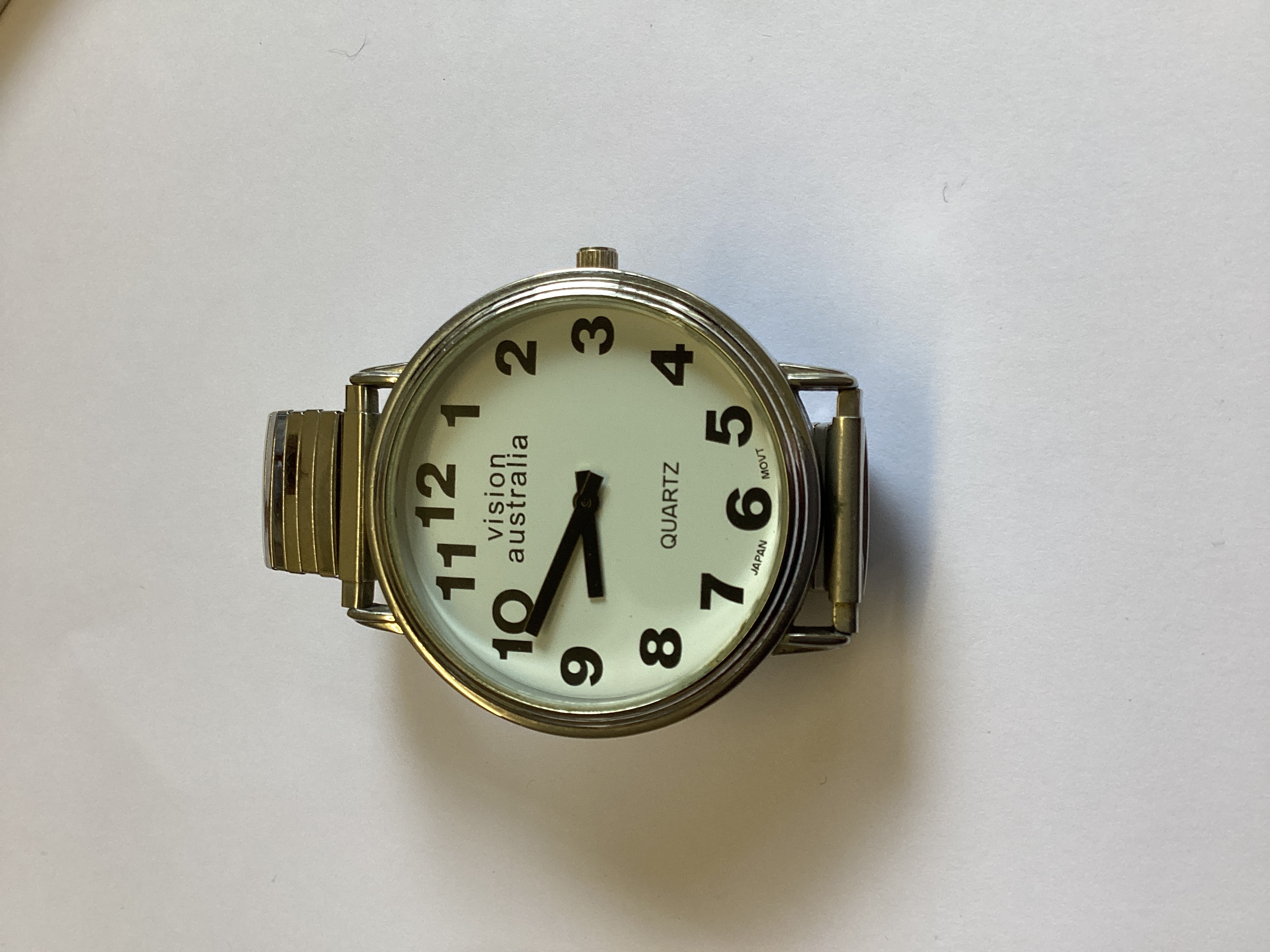 Vision Australia quartz watch with an integrated expanding bracelet. The round, silver-tone metal case houses a white dial with large, black Arabic numerals for all hours. Black hour and minute hands indicate the time. The dial features “vision australia” below the 12 o’clock position, “QUARTZ” above the 6 o’clock position, and “JAPAN MOVT” flanking the 6 o’clock position. The watch exhibits minor surface wear consistent with general use.