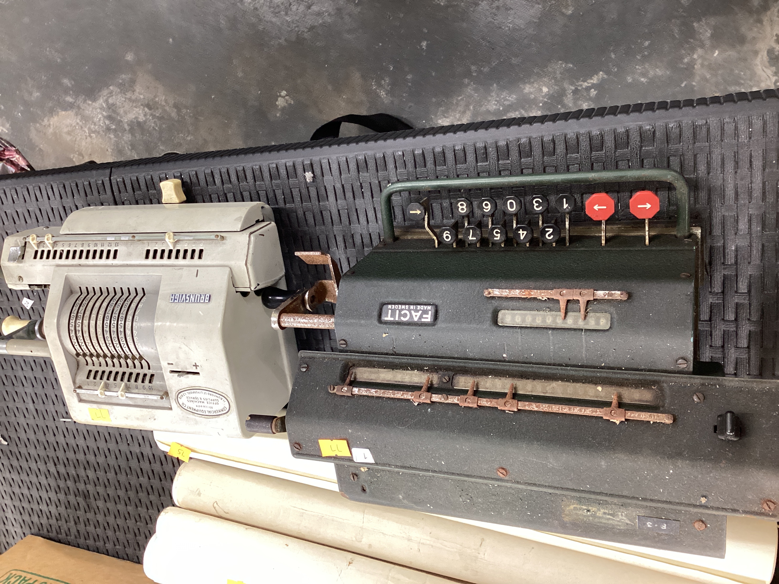 Two vintage mechanical calculators, including a Brunsviga model marked “F1005V055” and a Facit model marked “MADE IN SWEDEN” and “F.3”. Both exhibit wear consistent with age, including surface rust, dust, grime, and paint loss. The Facit shows more pronounced rust on its metal components and screws. The Brunsviga is light grey with cylindrical number display drums. The Facit is dark grey or dark green with a lever-based input system, circular number keypad, and two red arrow buttons. Both are constructed primarily of painted metal with some plastic or bakelite components. Inventory labels are affixed to both items.