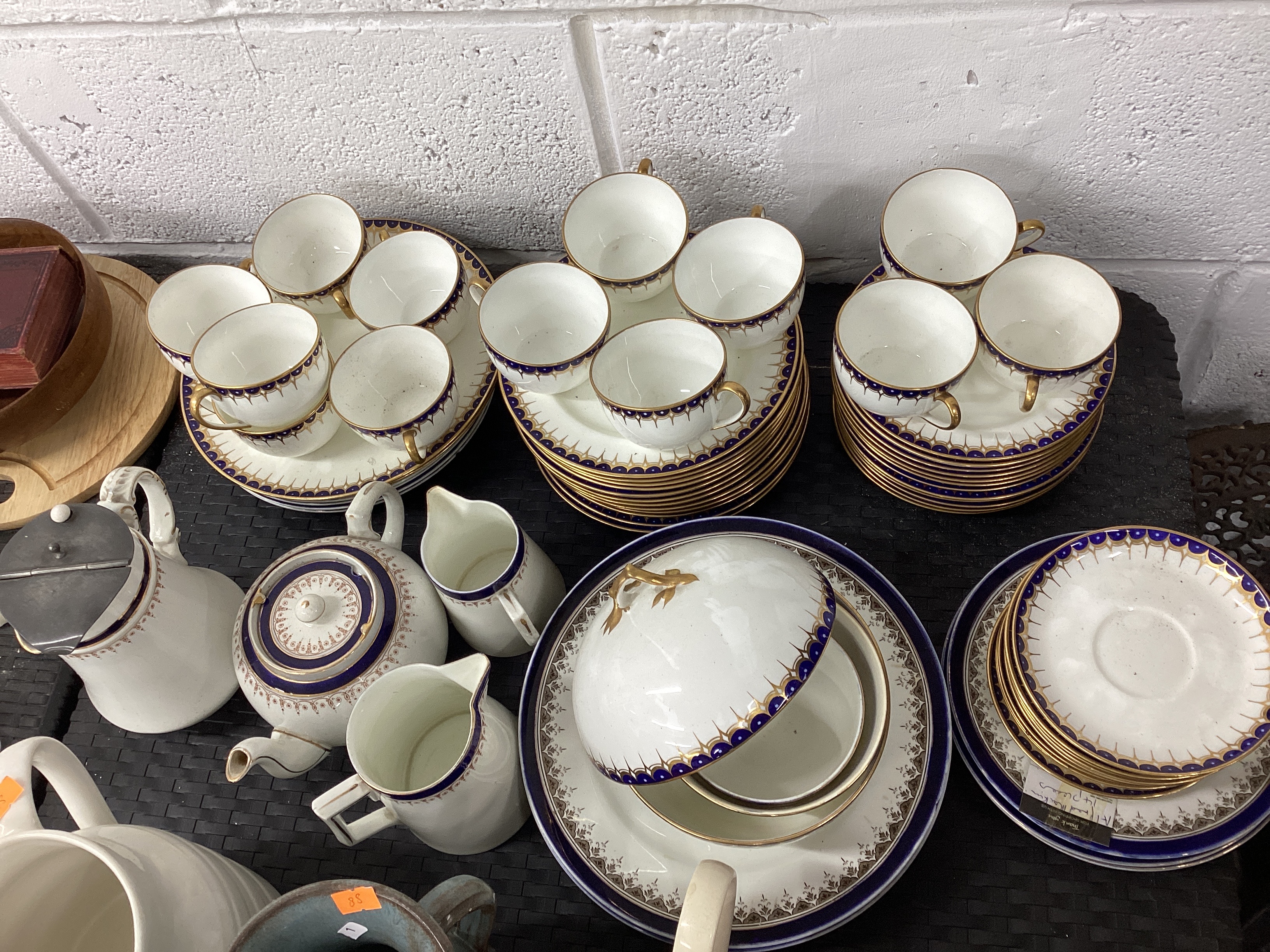 This is a part tea and dinner service in the Aynsley “Leighton Cobalt” pattern. The service is primarily white porcelain or fine china with a deep cobalt blue rim, extensive gilding on the edges and handles, and a border of gold stylized scallops or lappets. Some of the larger pieces have a brown and gilt foliate or scroll pattern beneath the blue rim. The service includes numerous cups, saucers, side plates, a teapot, and two creamers. A retail label indicating “14 pieces” is present on one stack of plates. The service appears to be in generally good condition with minor surface dust.