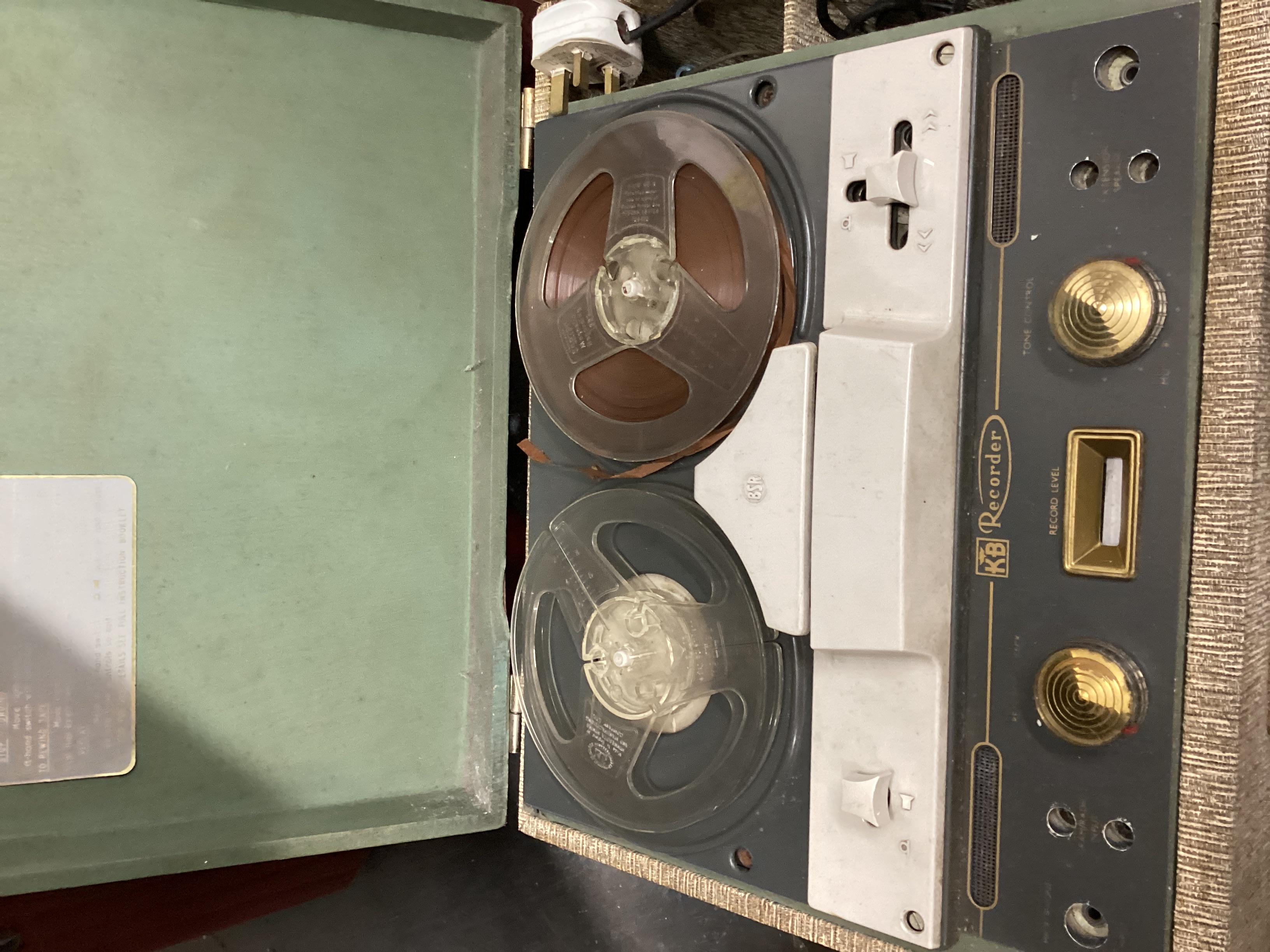 This Kolster Brandes RT20/1 reel-to-reel tape recorder/player is housed in a suitcase-style case covered in a light-colored, textured fabric with a hinged green lid. The interior features a dark grey control panel with white plastic tape transport mechanism, brass-toned fluted knobs, and a ‘RECORD LEVEL’ meter window. Markings include “KB Recorder” and “BSR”. The unit contains two clear plastic reels, one with brown magnetic tape, and a connected white UK-style power plug. The case shows wear, particularly at the edges and corners, and some discoloration/debris on the lid interior. Operational instructions are partially legible on the lid interior, along with input labels such as “GRAM / RADIO INPUT” and “EXTENSION SPEAKER.”