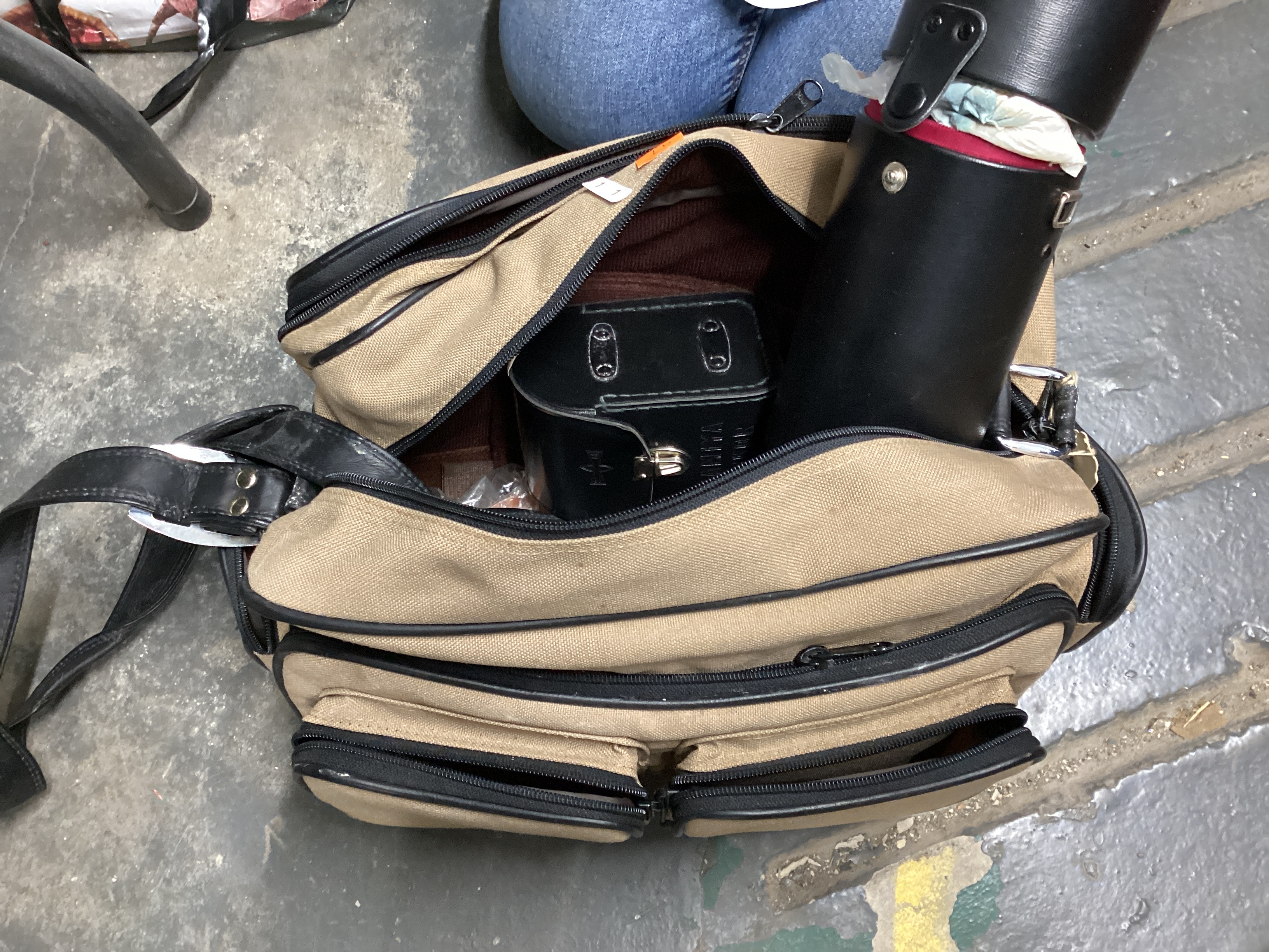 Vintage camera bag in tan canvas with black faux leather trim and straps. Multiple zippered compartments. Contains a rigid, cylindrical black case with a red lining and a smaller black pouch with a metal clasp. The pouch bears faint white text that appears to read “VALIMA KING” or “KALIMA KING.” The bag shows moderate wear, including creasing on the straps and minor fabric discoloration. A white tag marked “11” is attached to an exterior zipper pull.