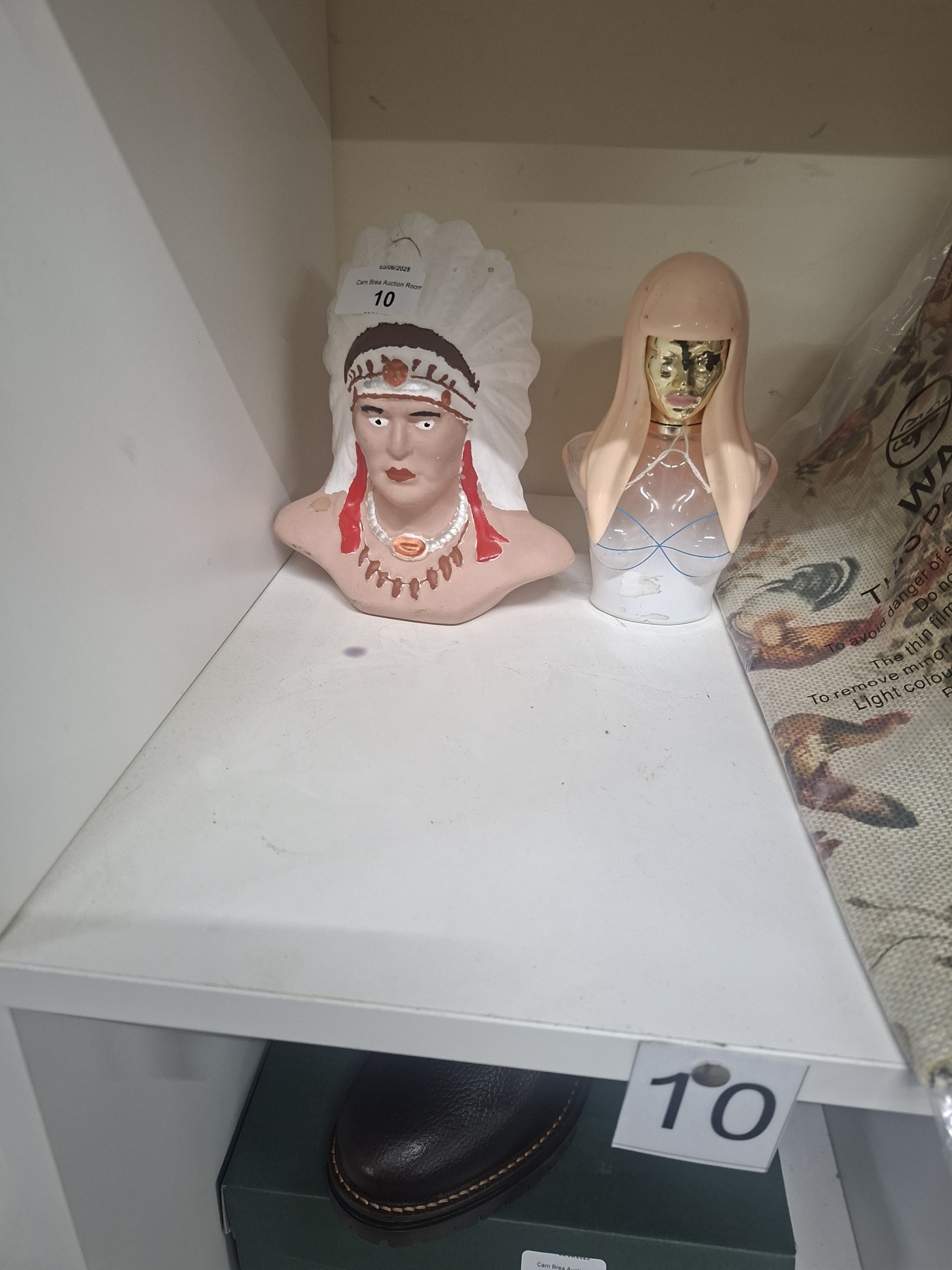 Two ceramic busts, one depicting a Native American woman and the other a modern woman, showing minor paint imperfections.