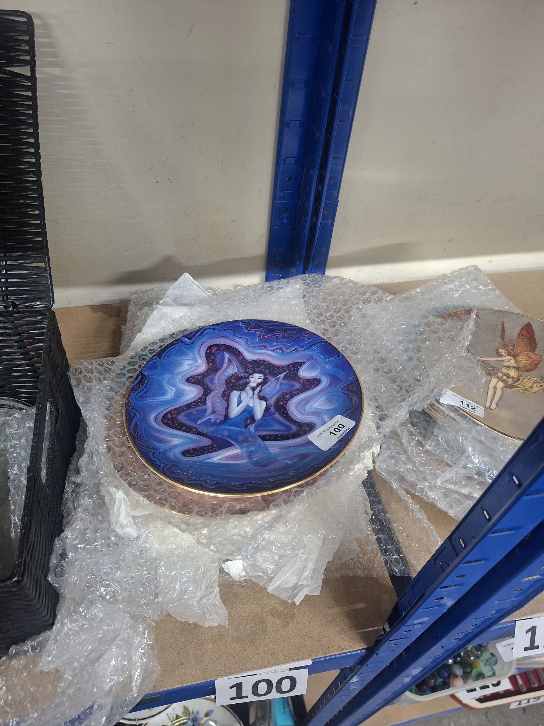 Circular plate with gold edge, featuring a printed image of a winged woman in blues, purples, and pinks.