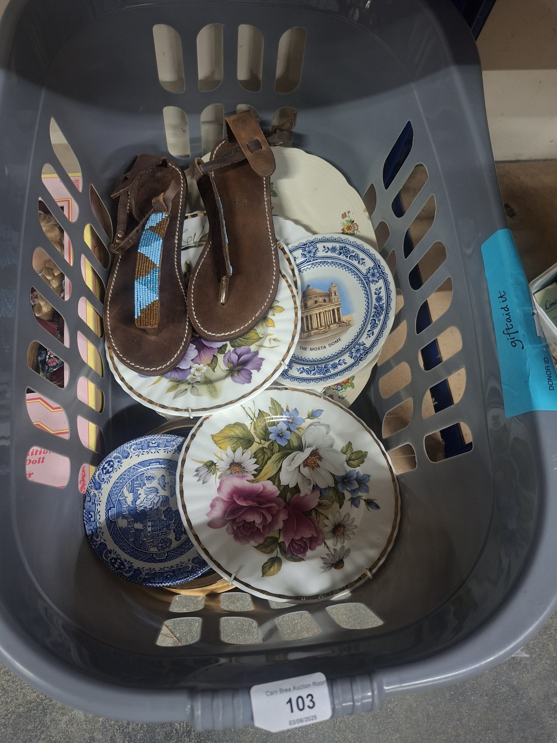 Gray plastic laundry basket containing two pairs of leather sandals, several decorative ceramic plates, and other items.