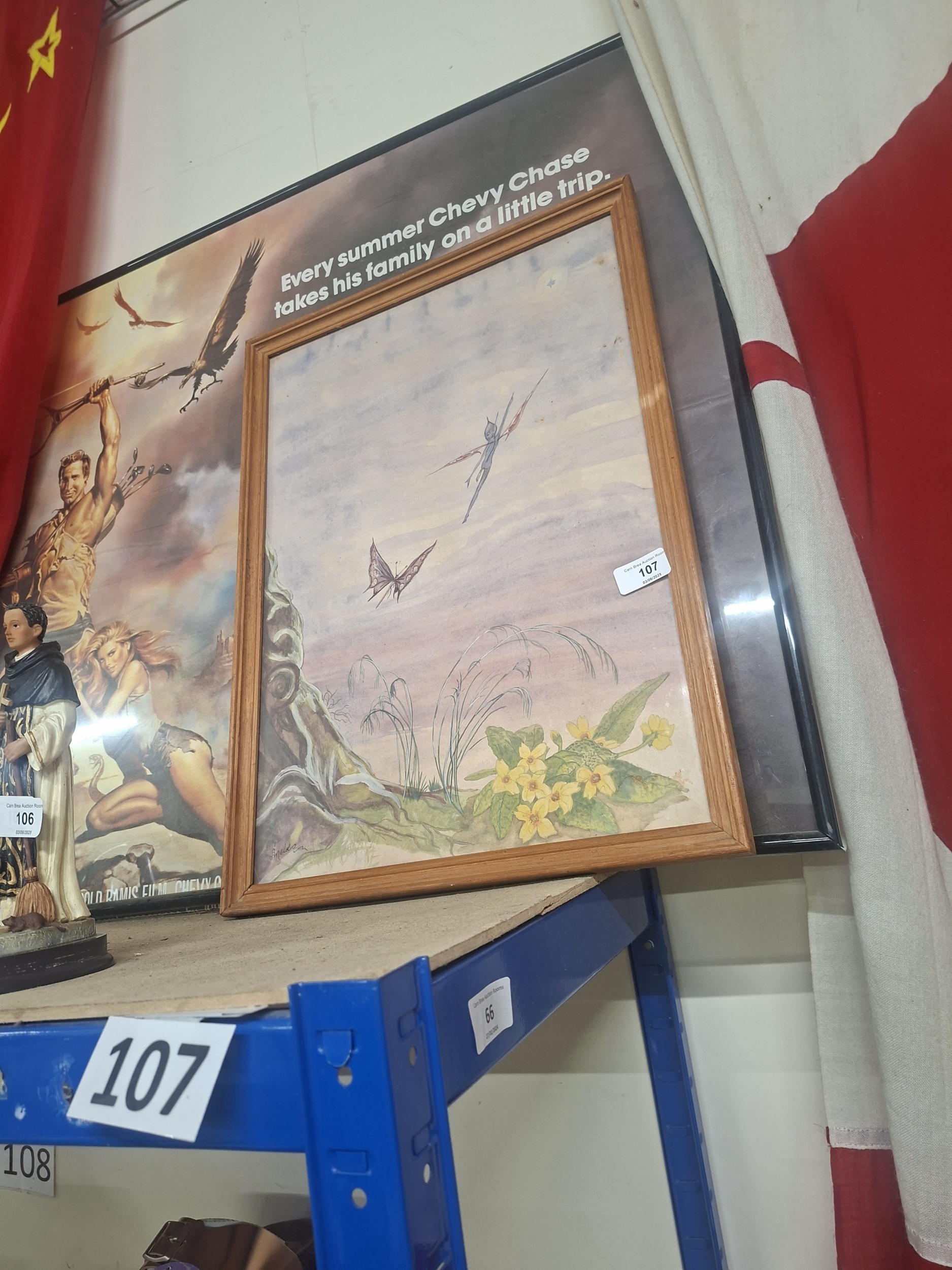 A framed watercolor painting depicts fairies, butterfly, grasses, and flowers in a pale landscape.