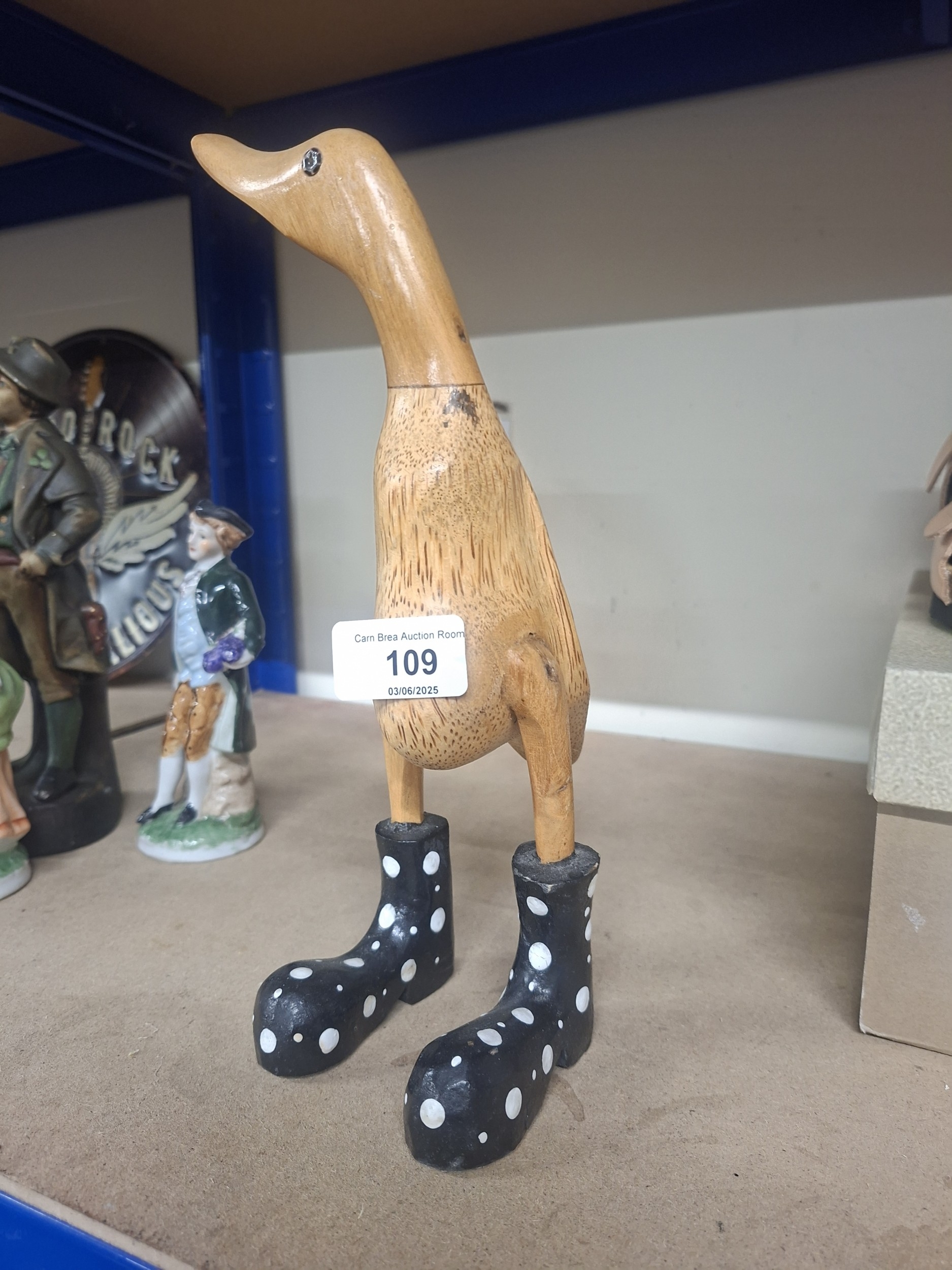 A light brown, wood-grained duck figurine stands on black boots with white polka dots, showing minor imperfections.