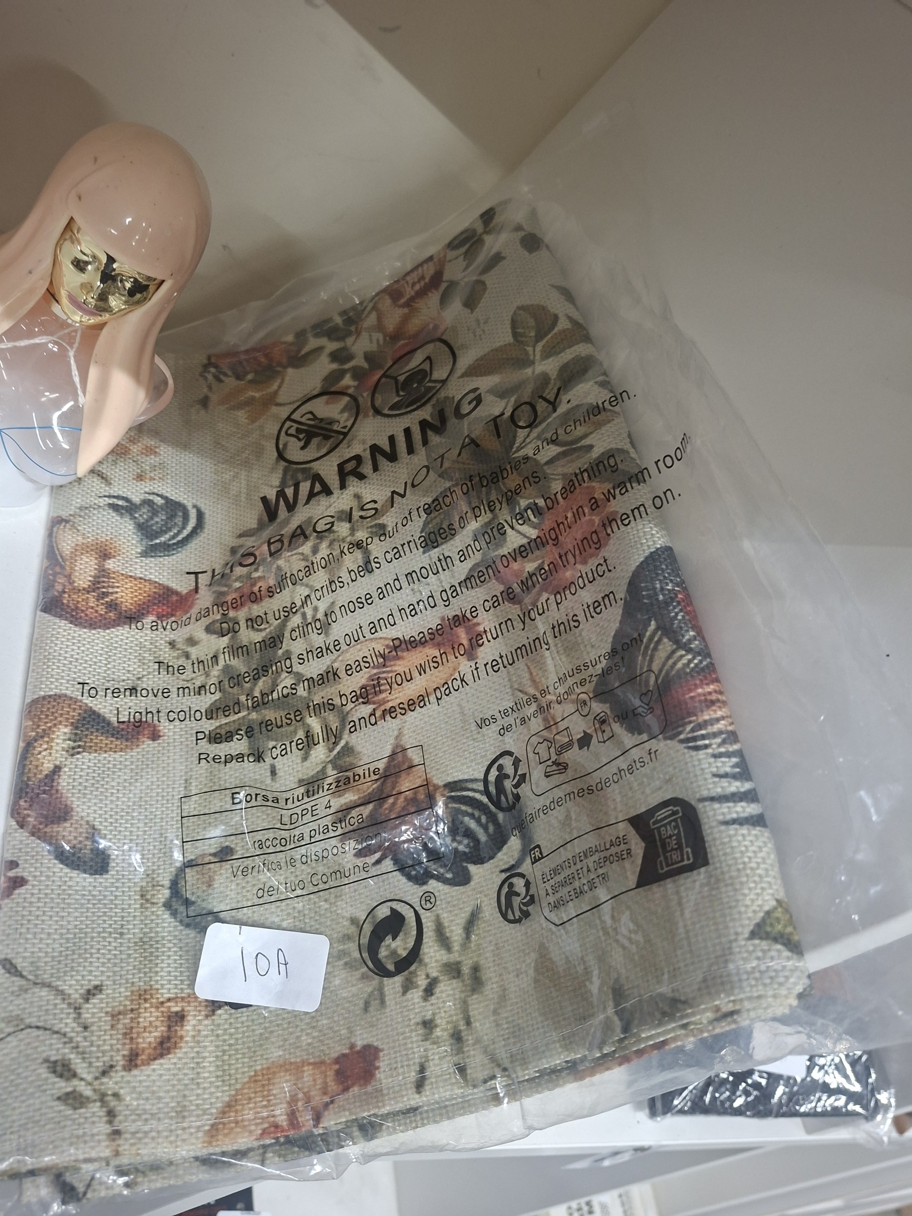 A folded fabric bag with a rooster and floral pattern, in a clear plastic bag.