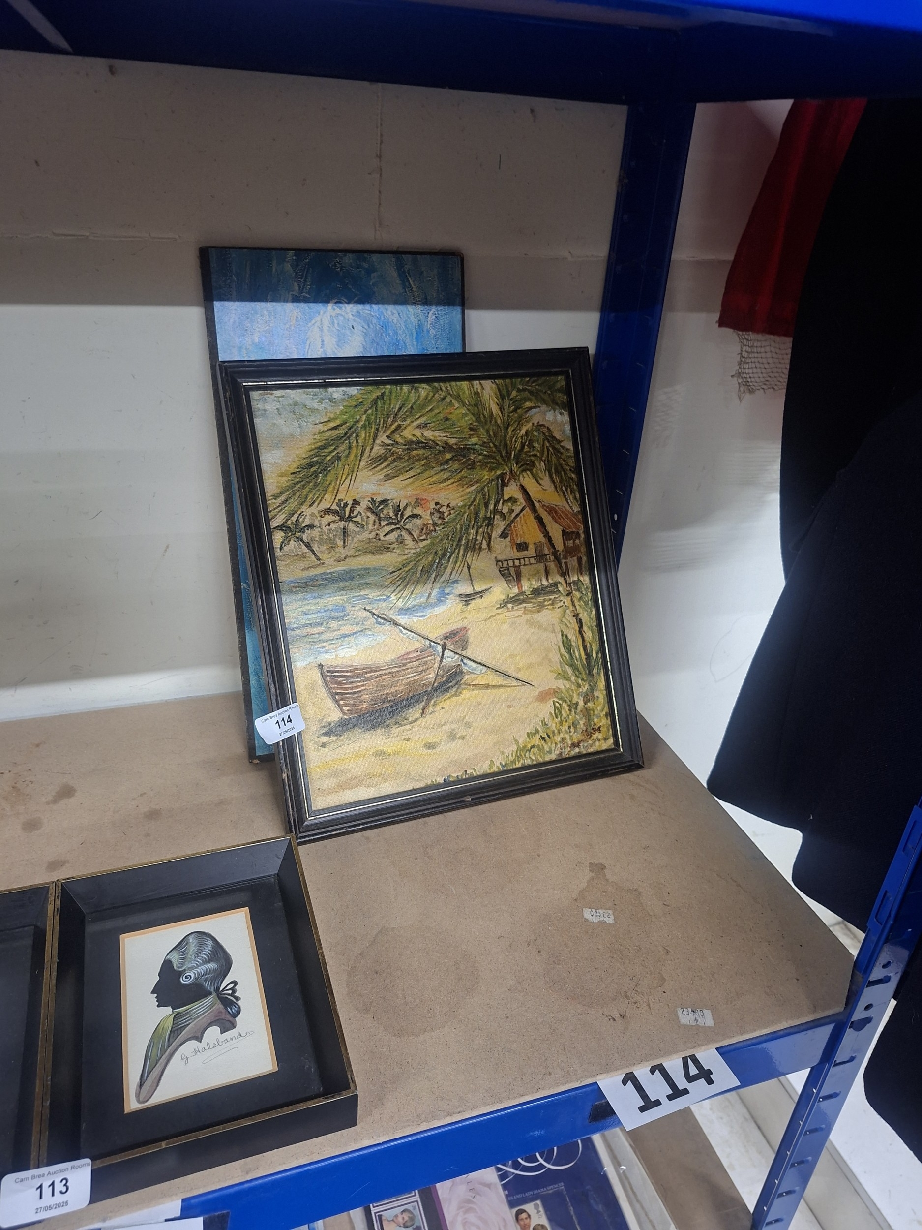 A framed painting depicts a beach with a boat, palm trees, and a hut.