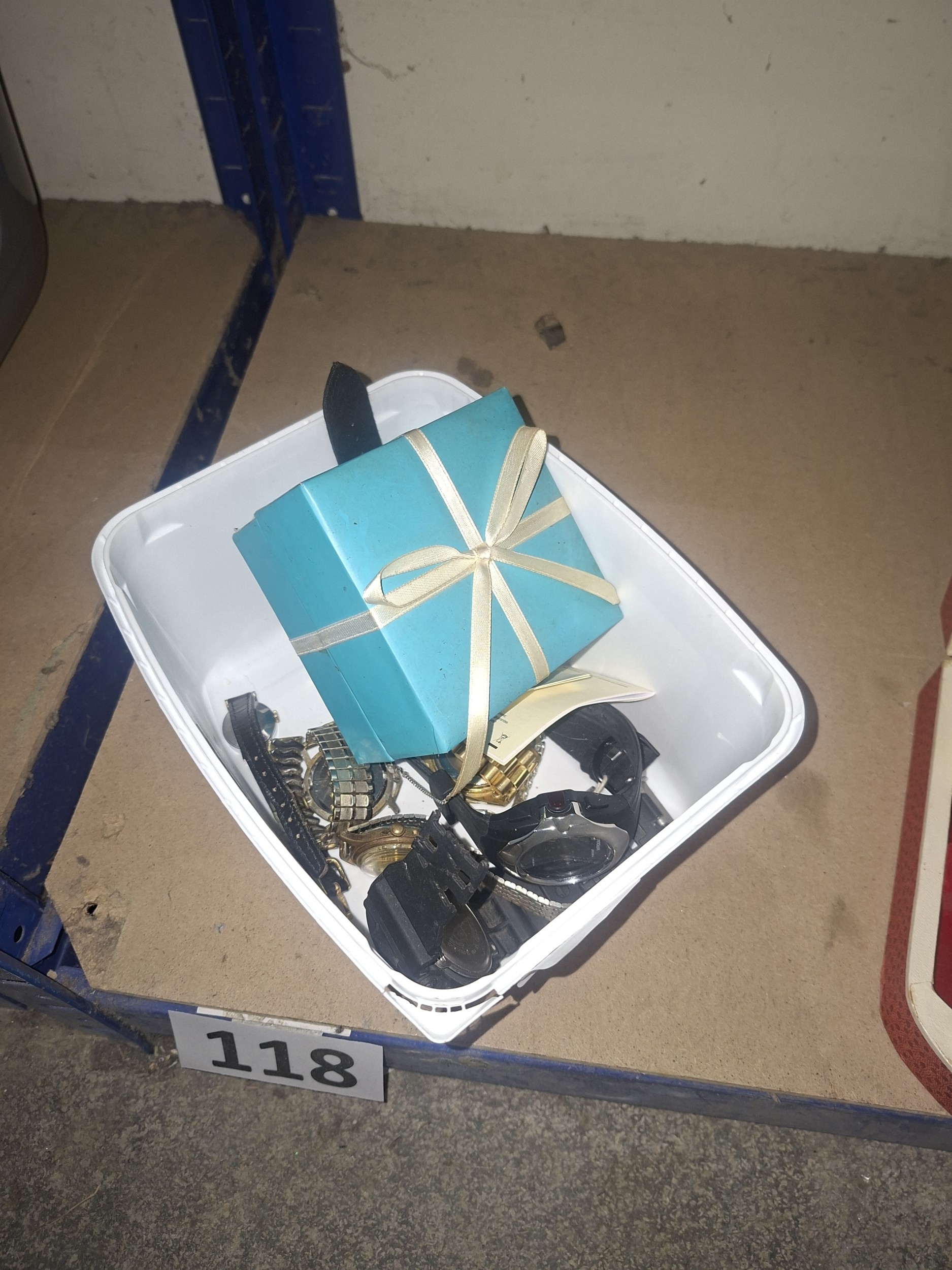 A collection of wristwatches of varying styles and metals are contained in a white plastic container with a teal gift box.