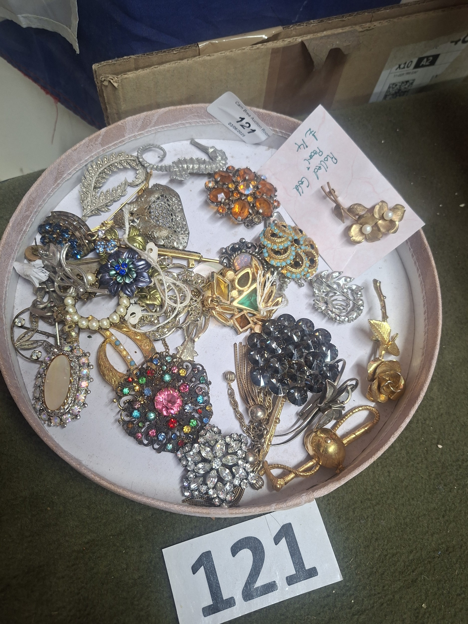 A round container holds a varied collection of gold, silver, and gemstone brooches and jewelry pieces.