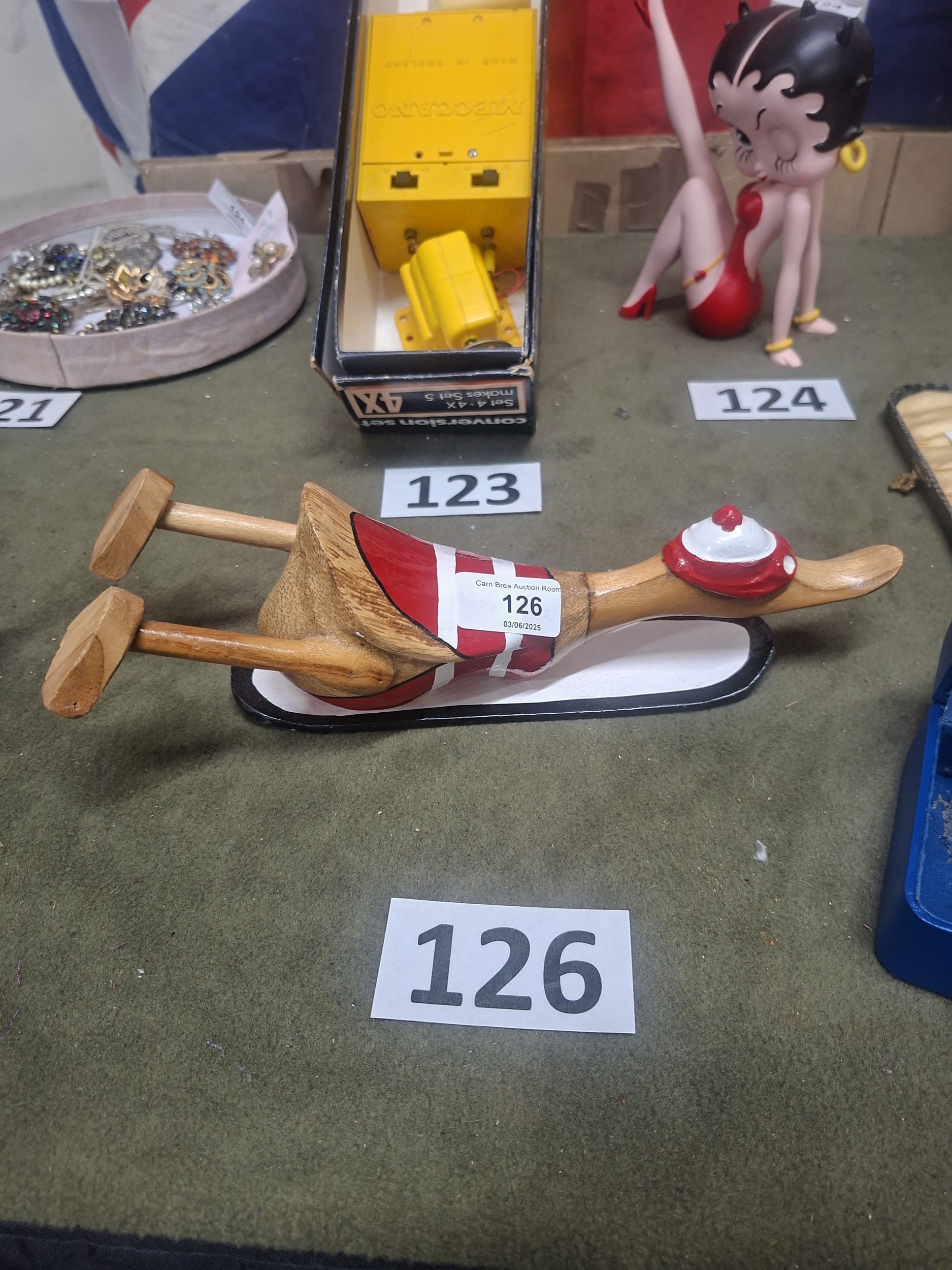A small, hand-painted wooden duck figurine with red and white stripes on a black and white base.
