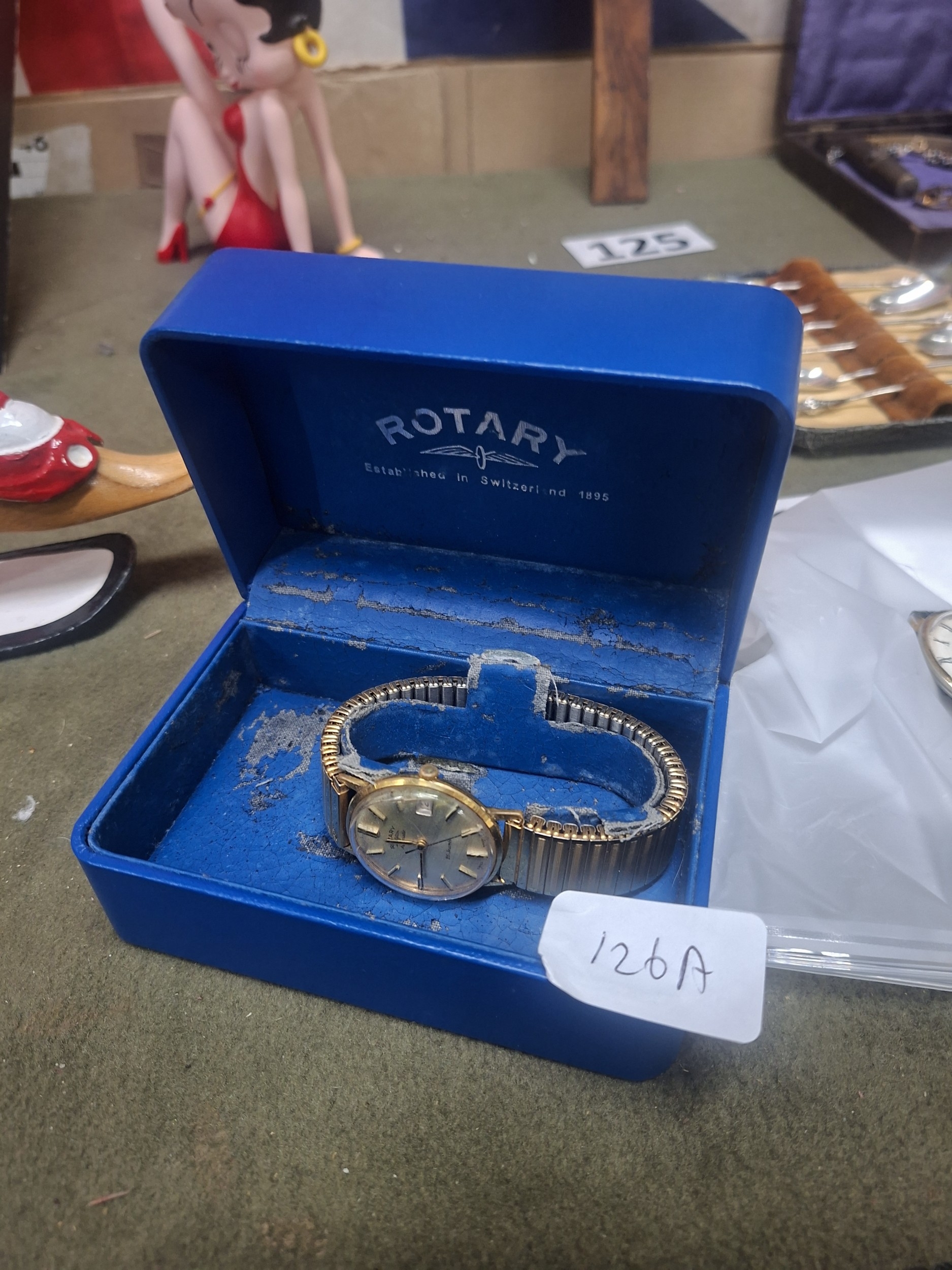 Pre-owned Rotary wristwatch in a worn blue box, showing signs of use.