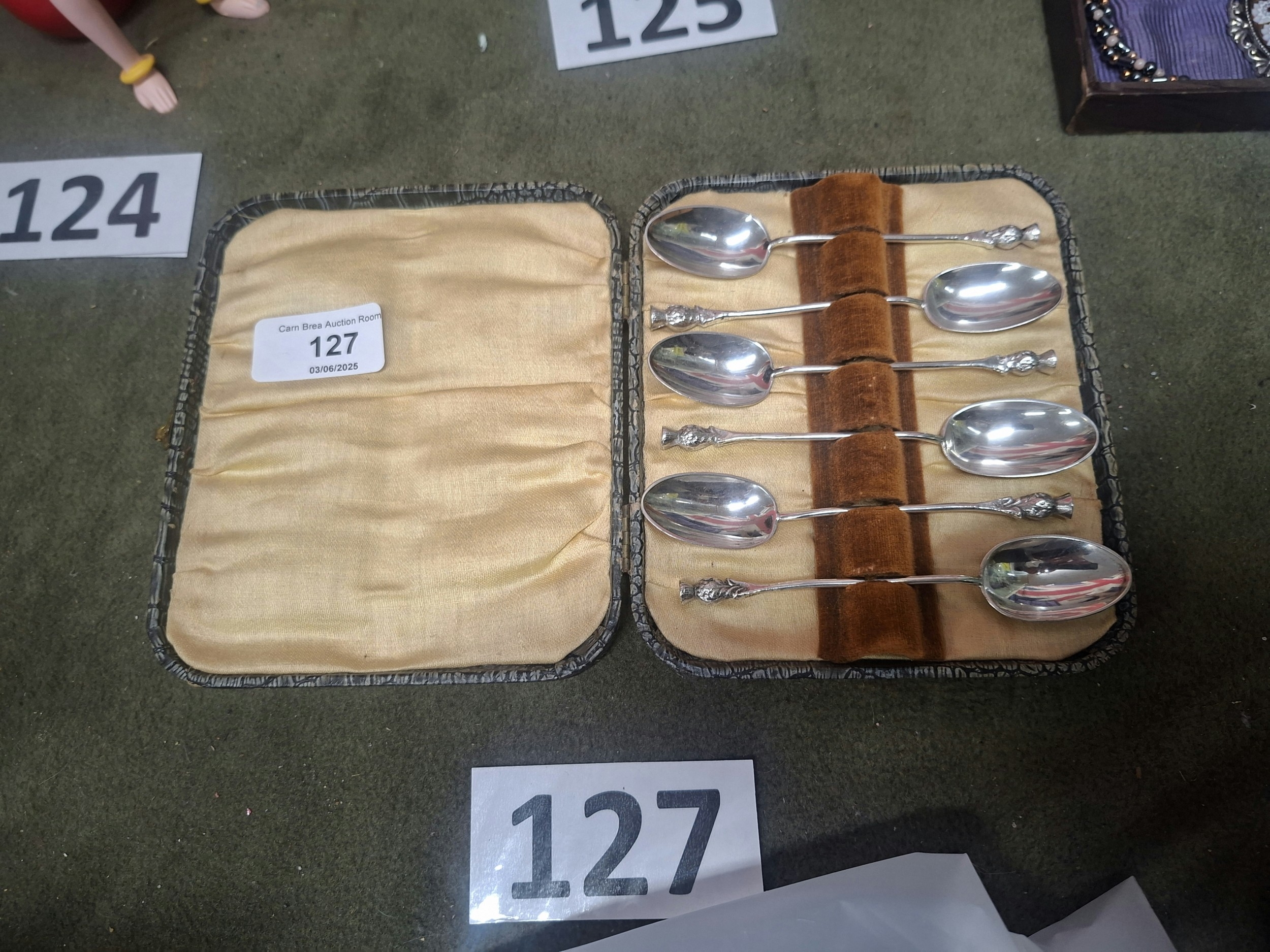 Set of six silver spoons with thistle-shaped handles in a dark brown, lined case.