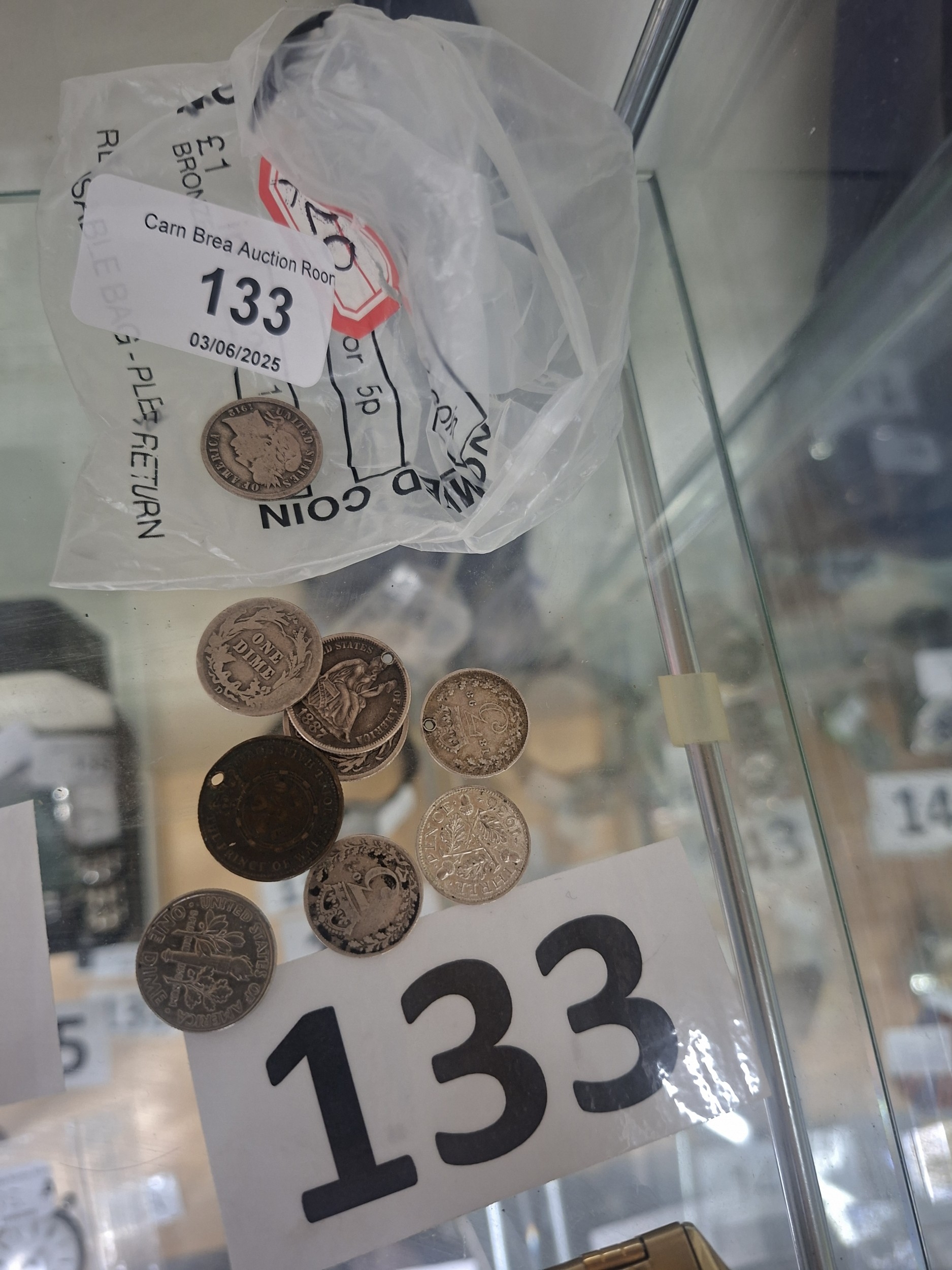 A plastic bag of assorted silver and bronze coins showing wear, some with holes, including US dimes.