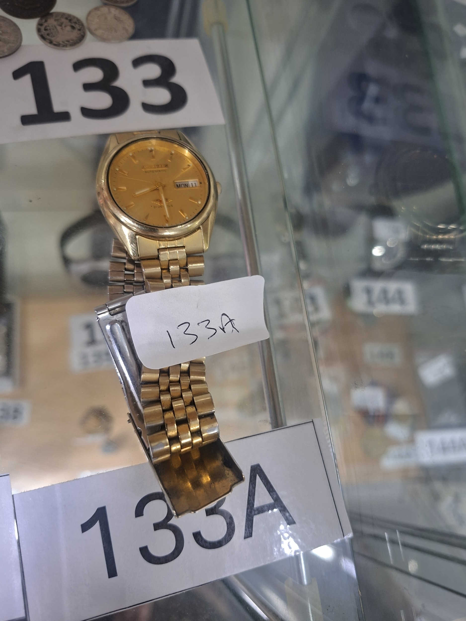 Gold-toned Citizen Automatic wristwatch with metal bracelet, showing minor wear.