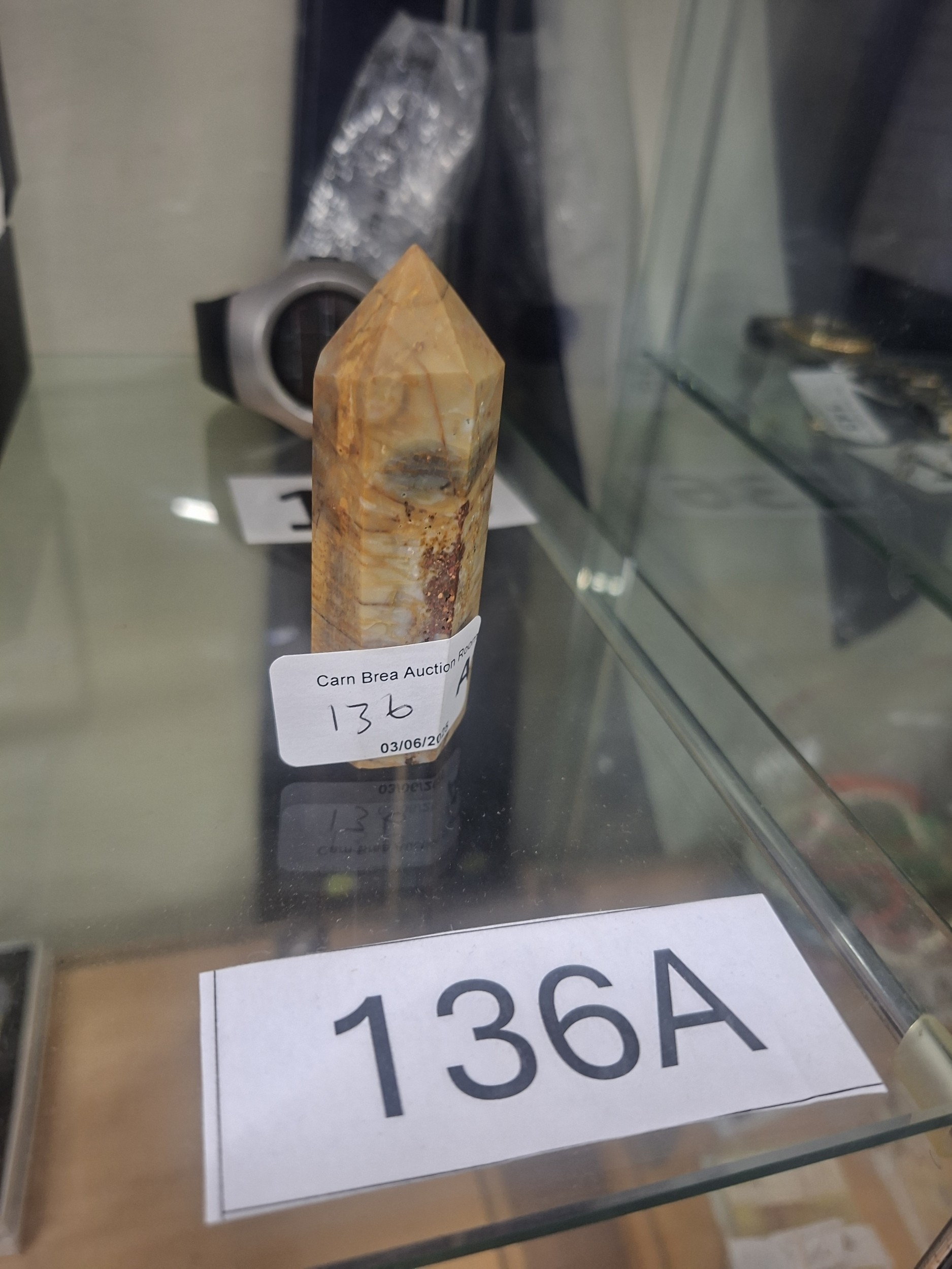 A polished, multi-faceted stone column with brown and orange veining, approximately 2-3 inches tall.