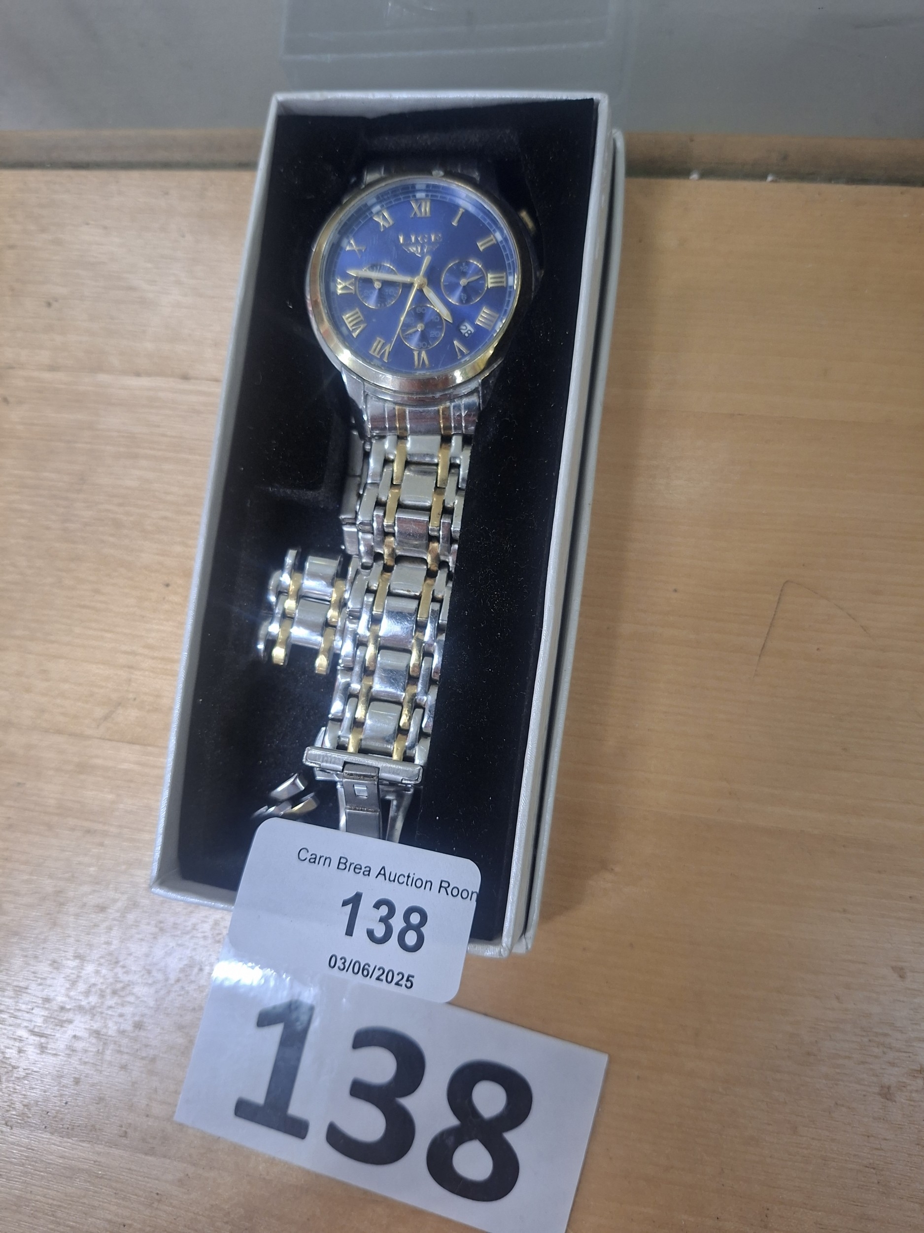 A new or excellent condition men’s LIGE wristwatch with a blue face, gold Roman numerals, and three sub-dials, presented in its original box.