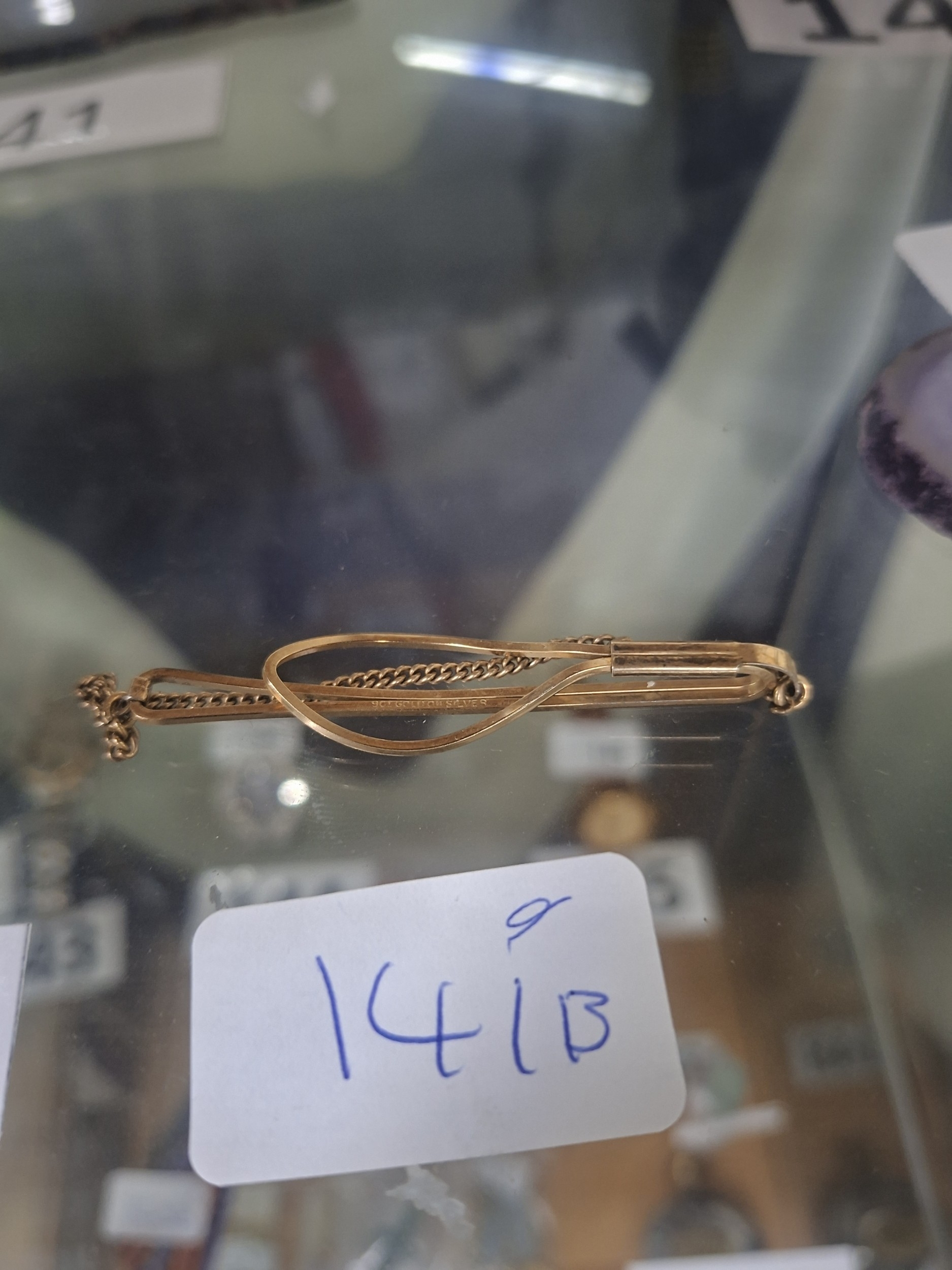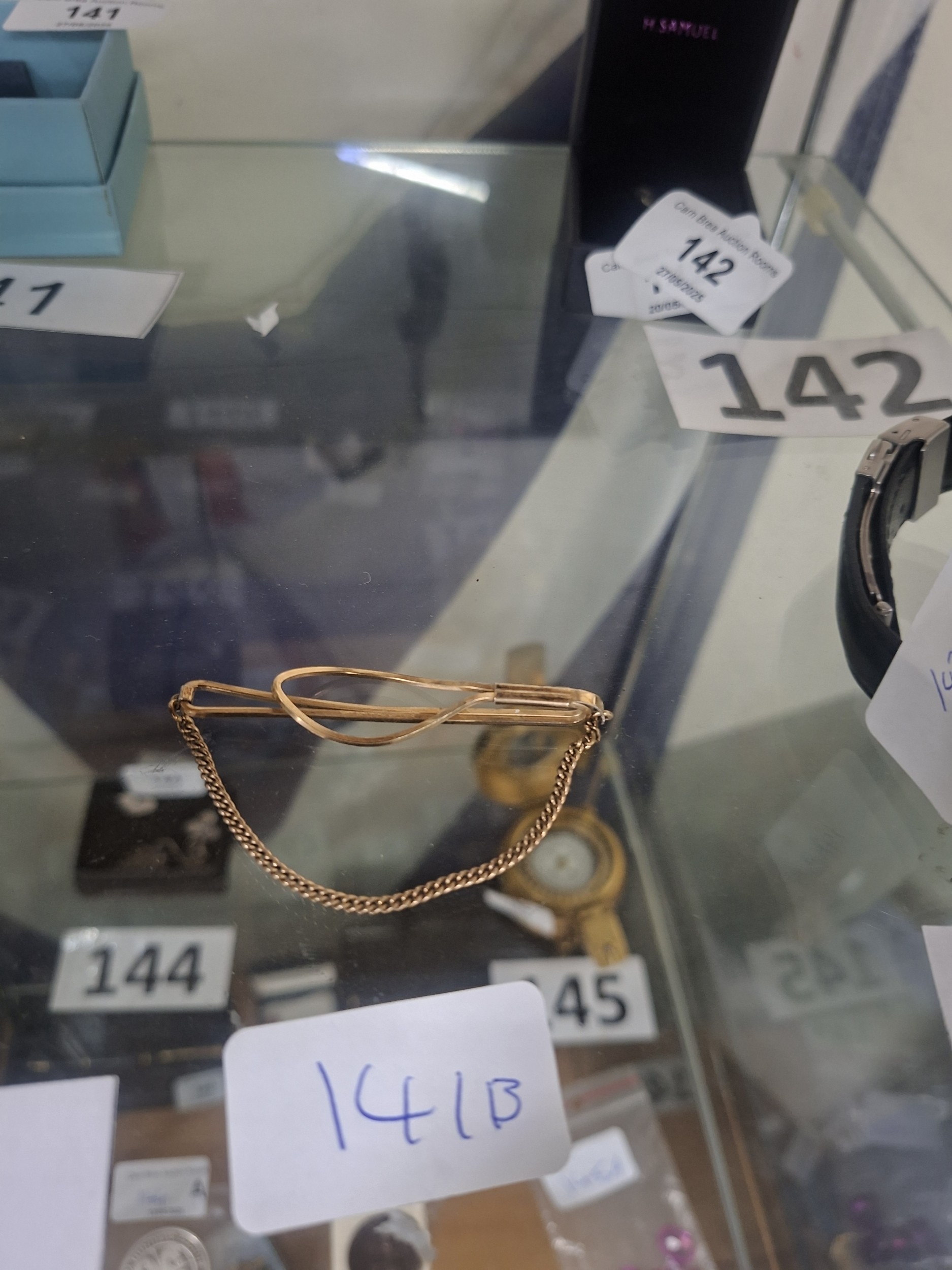 A gold-colored metal tie clip with a textured bar, partially visible “STERLING SILVER” inscription, and attached chain shows minor wear.