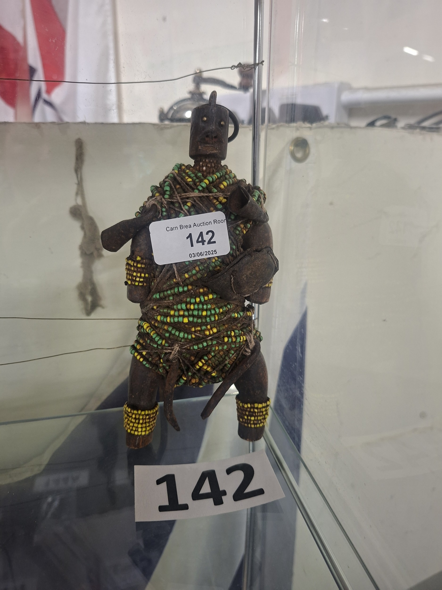 Small, dark-brown wooden figurine with green and yellow beaded adornments, showing wear.