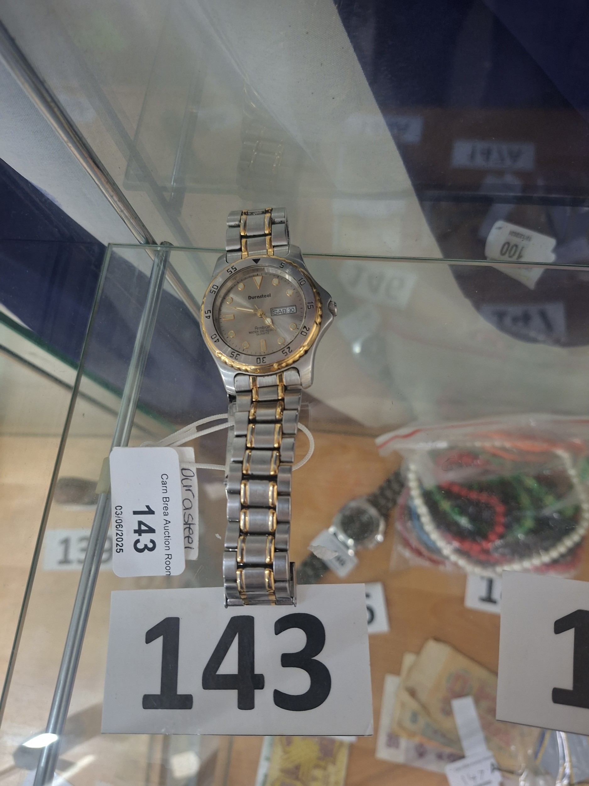 Two-tone gold and silver Durasteel wristwatch with a quartz movement and date function.