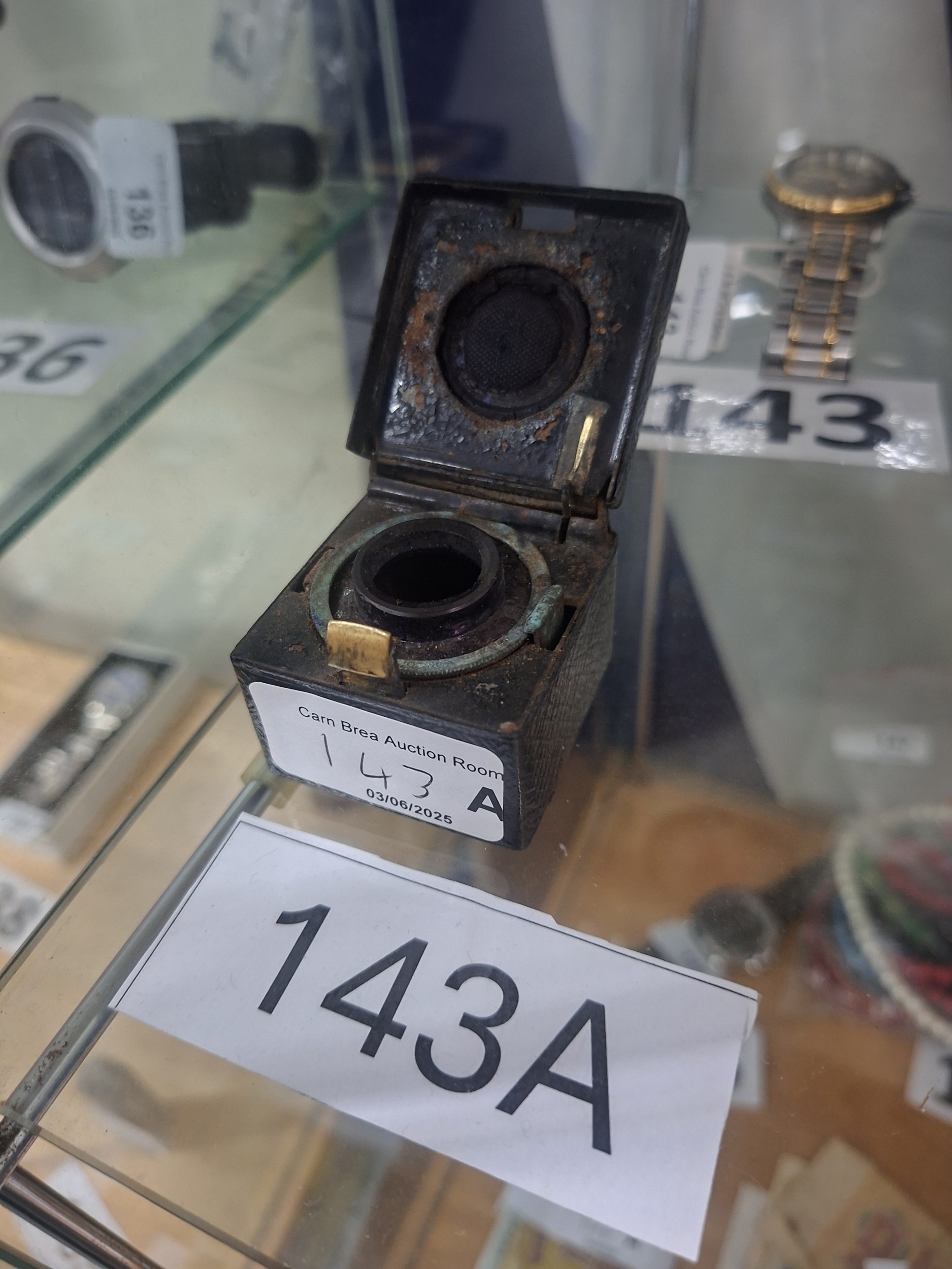 Small, square inkwell with worn black leather or leather-like exterior, dark metal interior showing rust, and a gold detail.