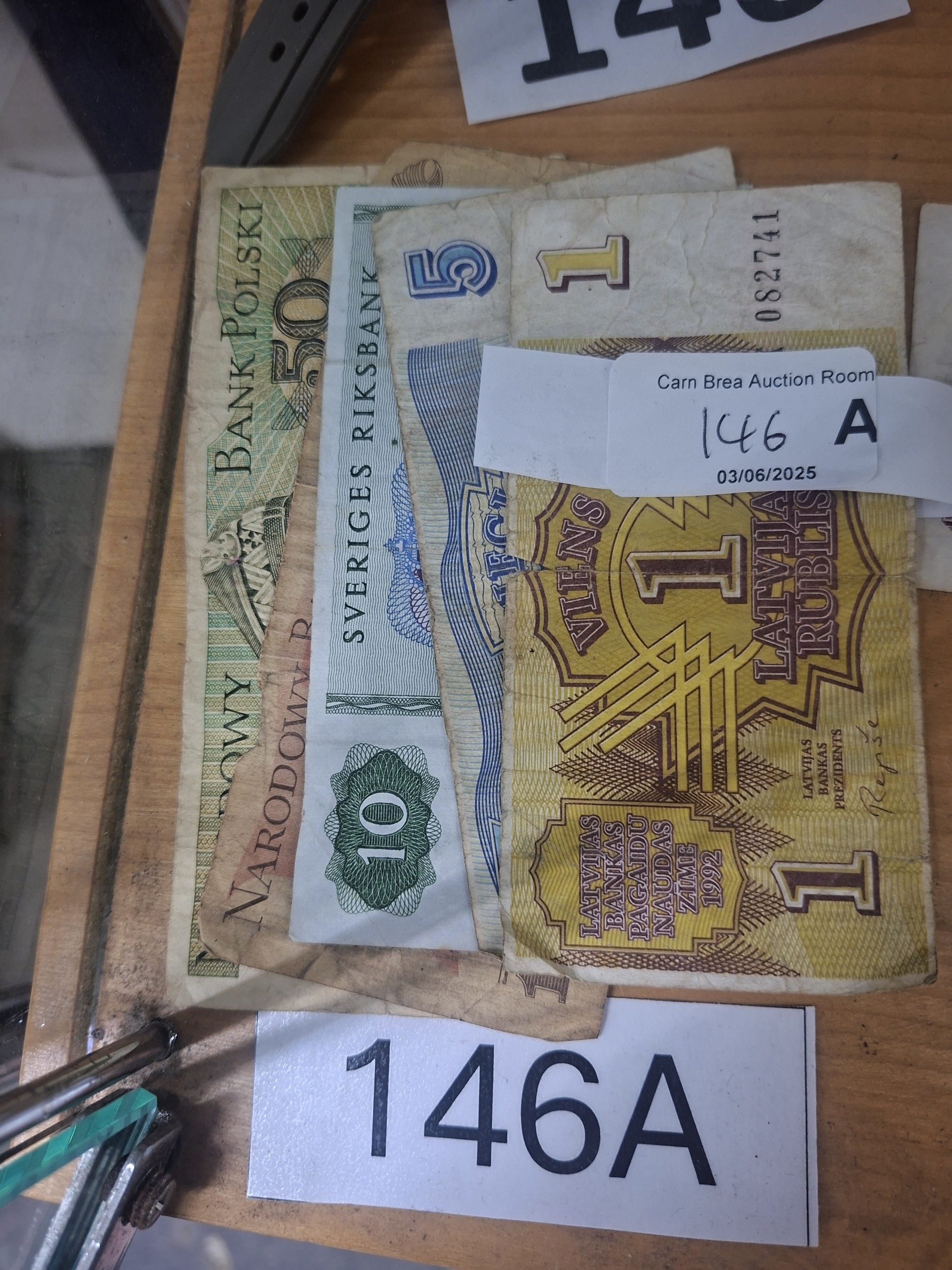 A stack of aged and worn banknotes from Poland, Sweden, and Latvia, showing tears and creases.