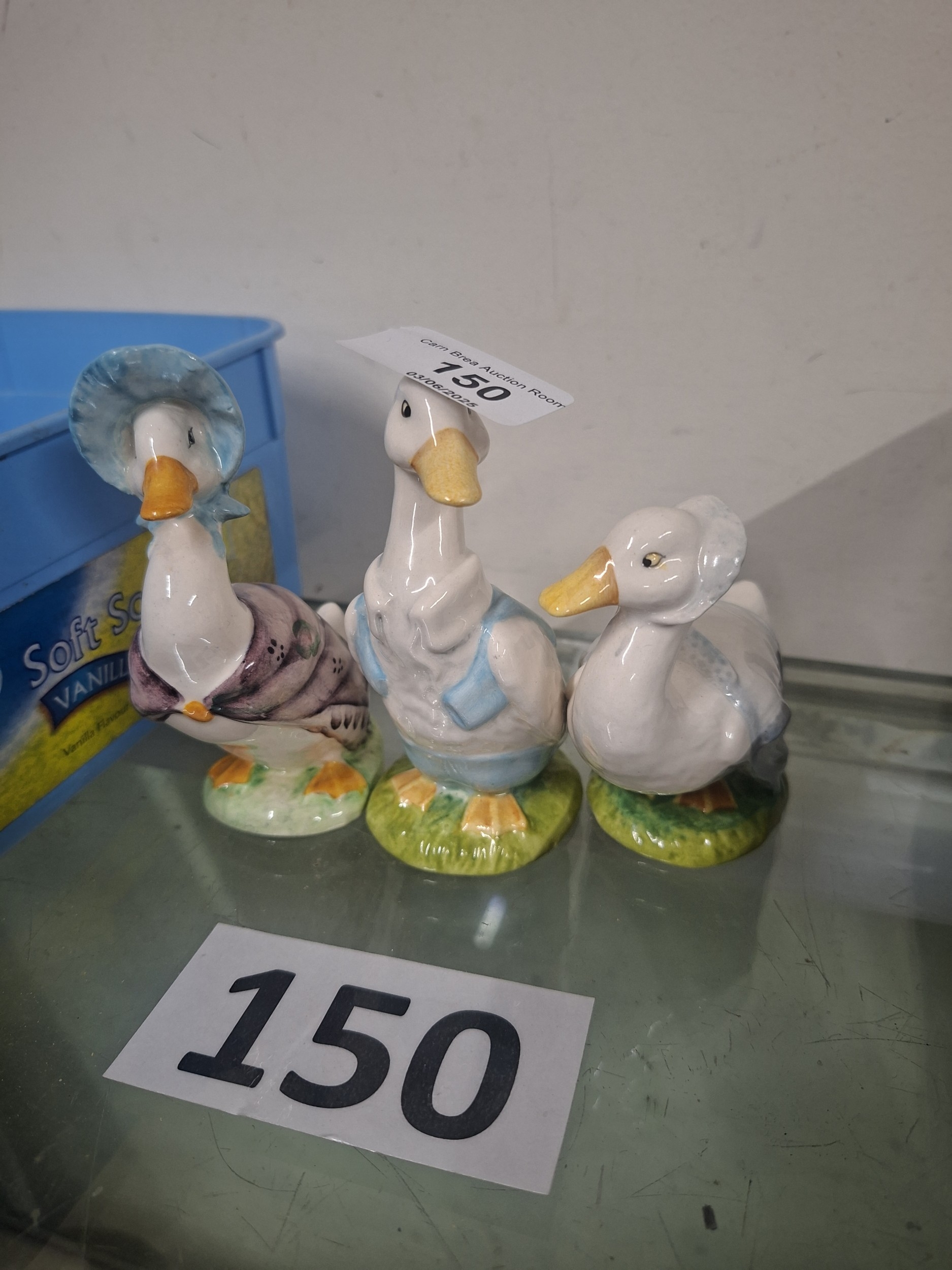Three hand-painted white ceramic geese figurines, two in bonnets and clothing, one in a vest and pants, on green bases.