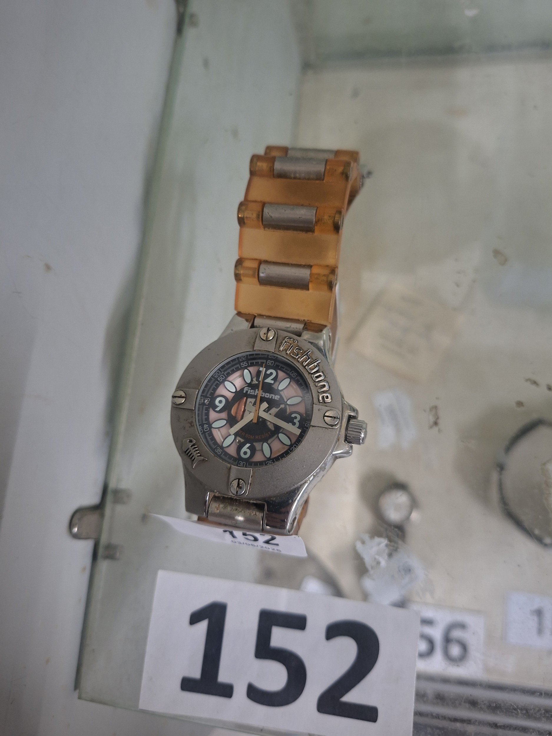 Silver-toned wristwatch with an amber resin bracelet, pink face, and “Fishbone” branding, showing minor scratches.