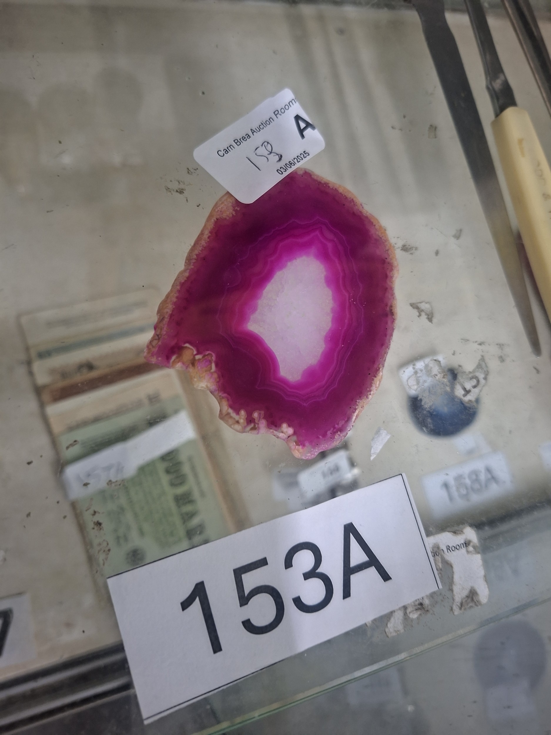 An oval-shaped polished agate slice with concentric pink and white bands and a tan outer edge.