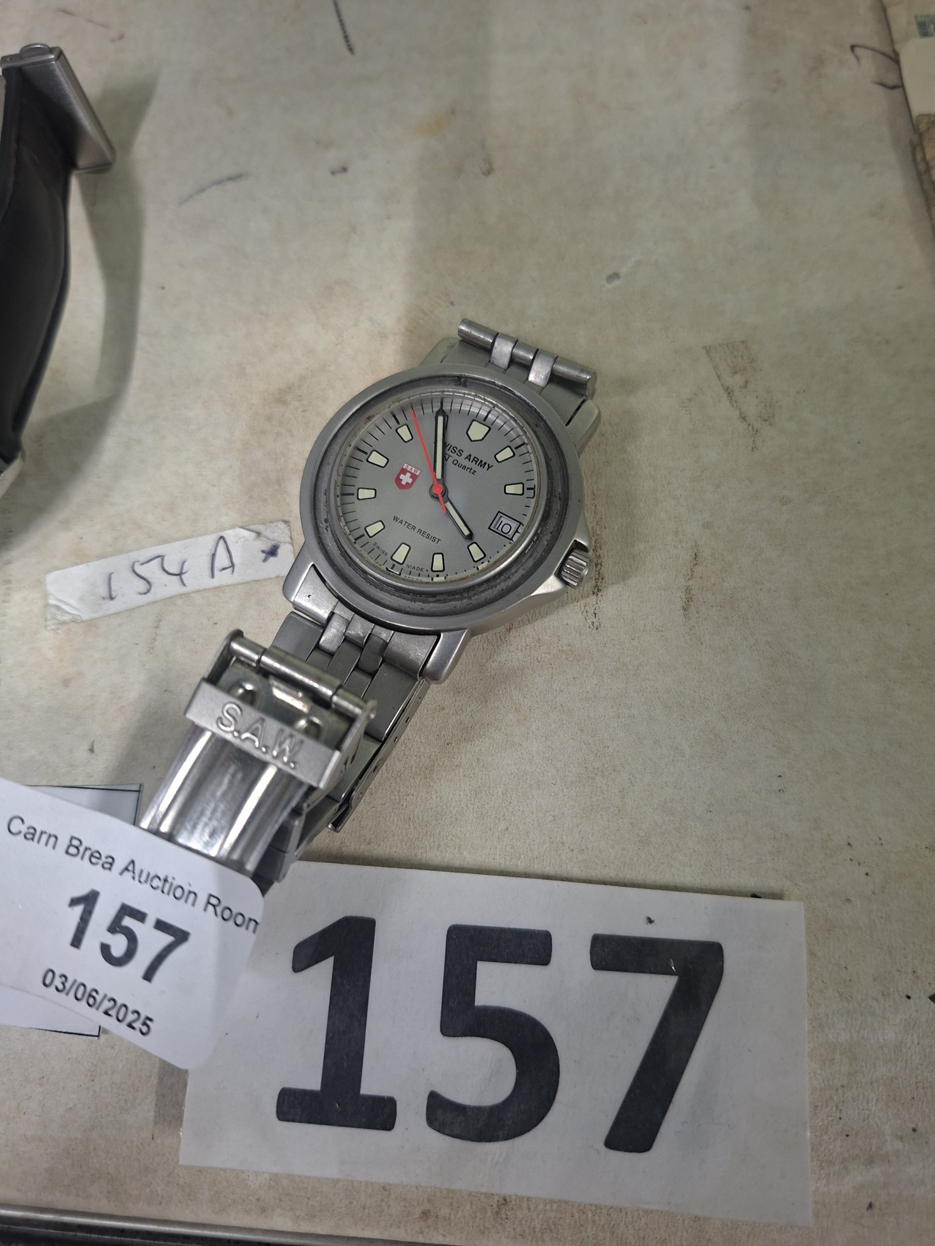 Silver-toned Swiss Army quartz wristwatch with a stainless steel band, showing minor wear.