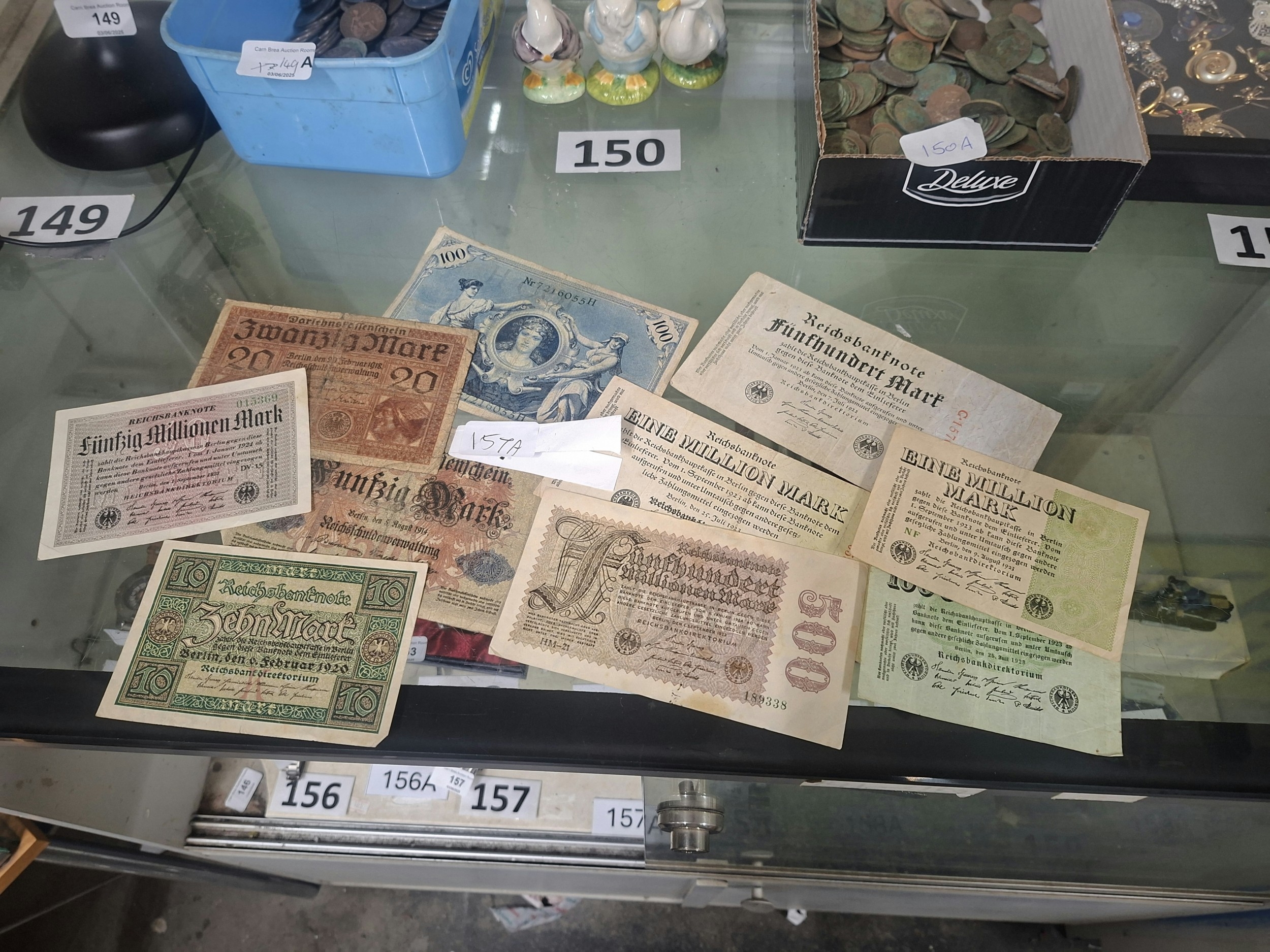 A collection of eight German banknotes of varying denominations and condition, including 1 million Mark notes.