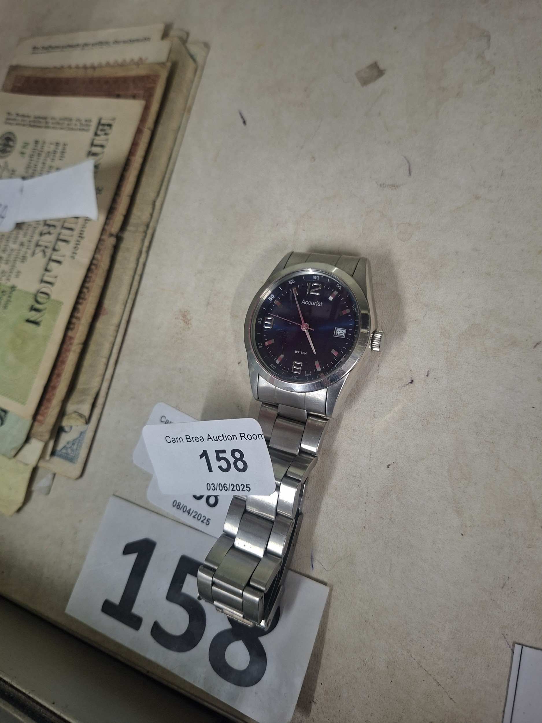 Accurist men’s wristwatch with stainless steel band and case, dark blue face, minor scratches.