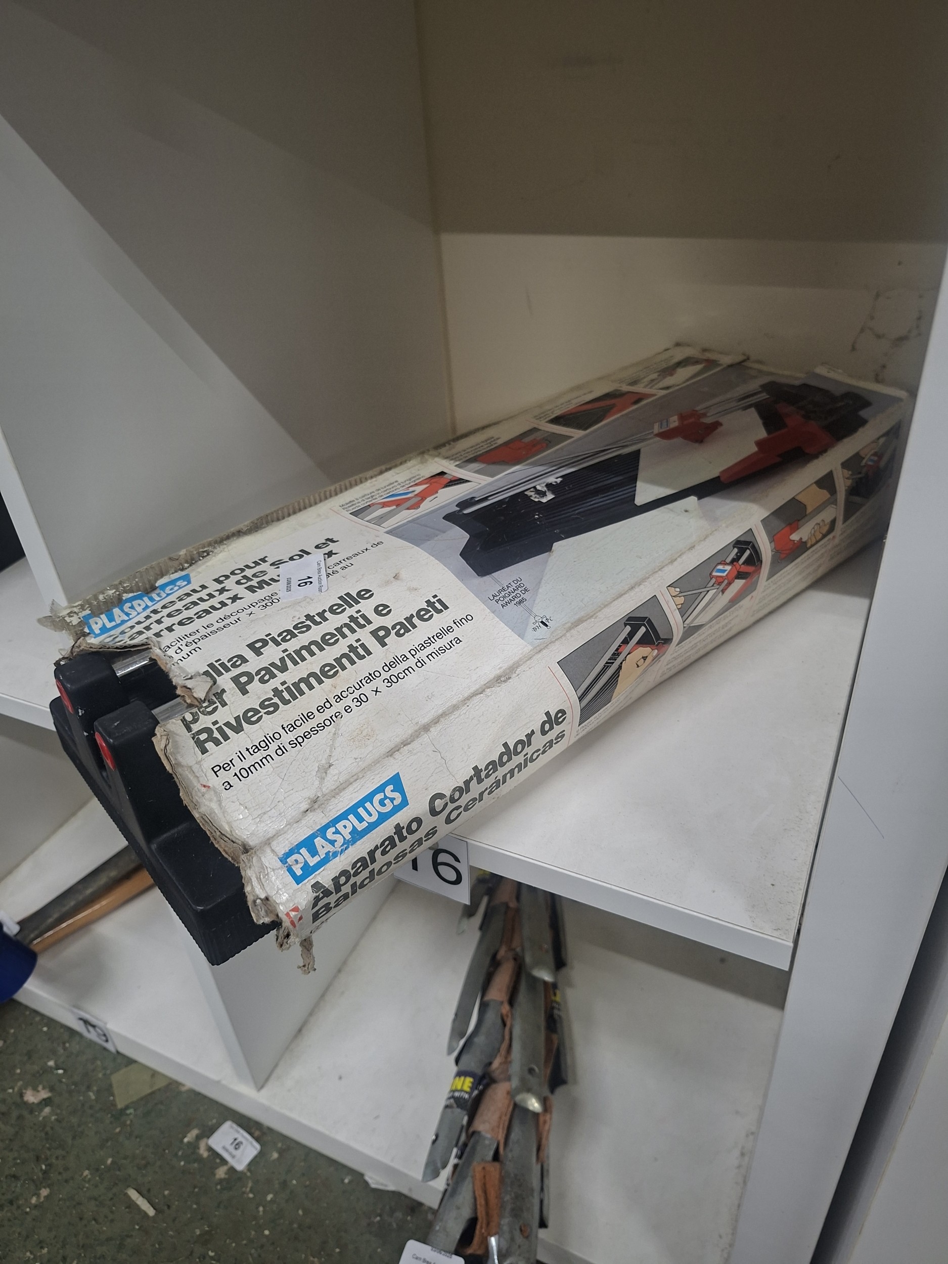A used Plasplugs tile cutter in a partially opened, worn box with multilingual labeling.