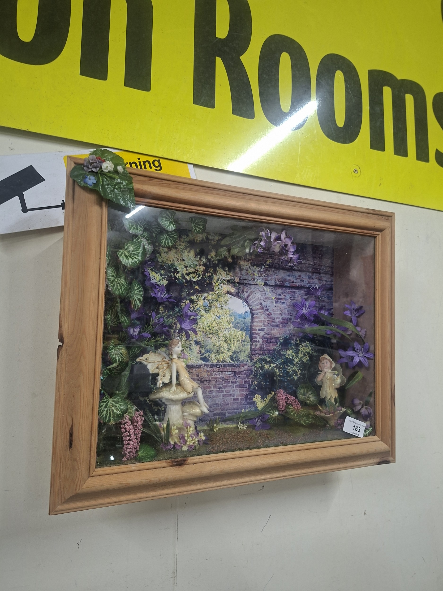 A shadow box diorama features two fairy figurines, artificial flowers, and a printed garden scene.