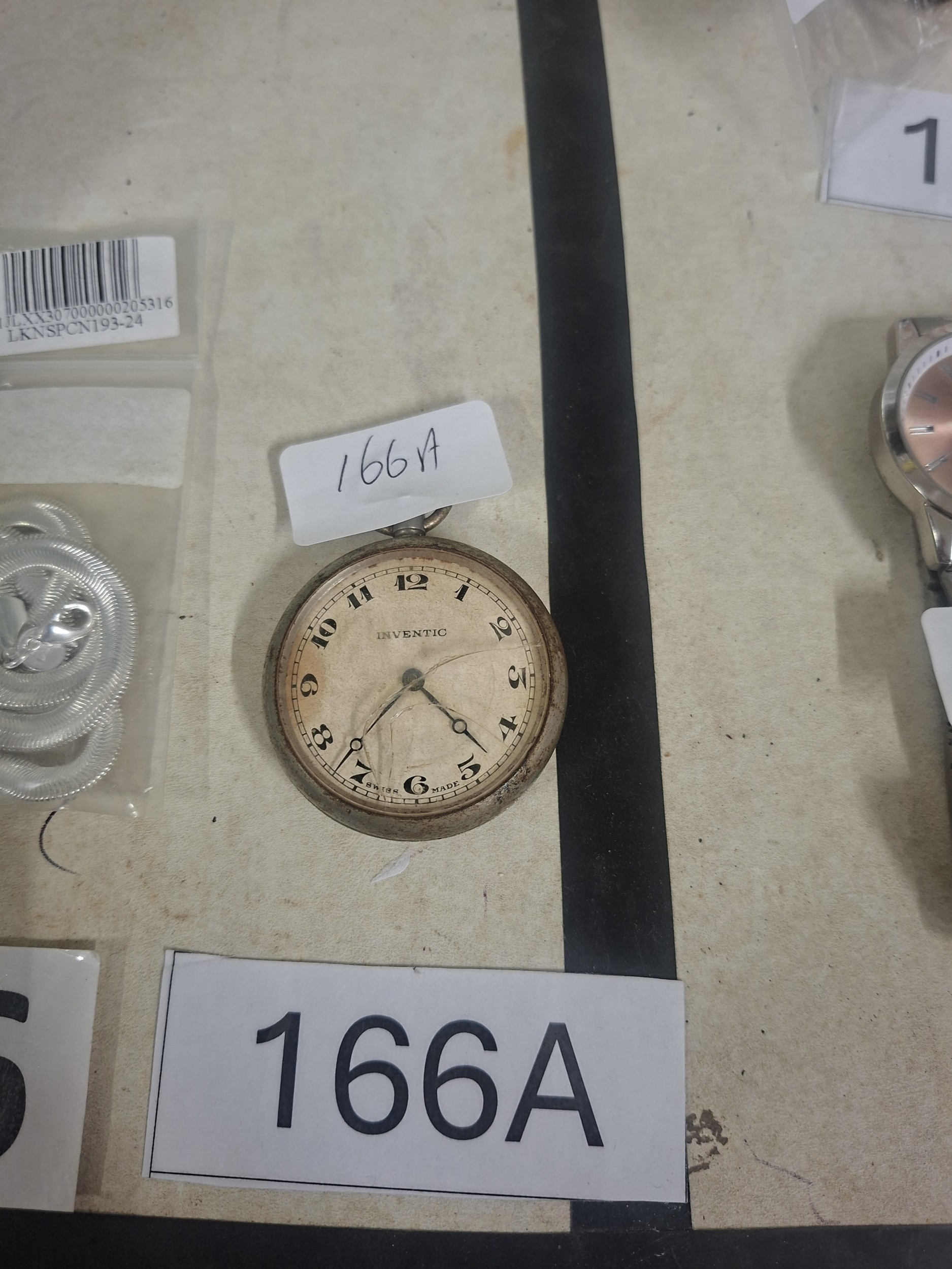 A worn silver-toned pocket watch with a cracked face, showing “INVENTIC” and “SWISS MADE” markings.