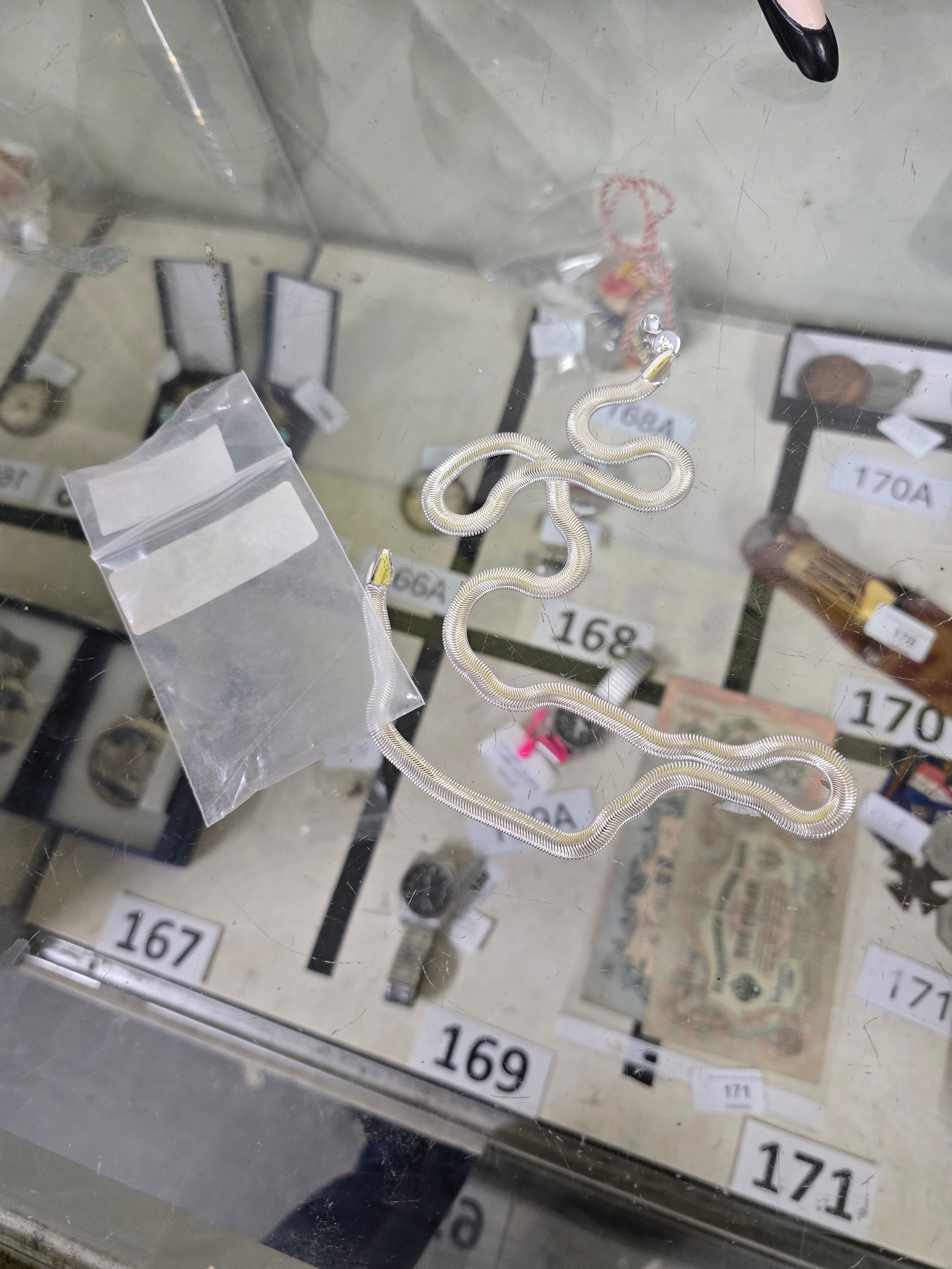 A silver-toned metal necklace with a snake or wave-like design, composed of many small, interlocking, ridged segments.