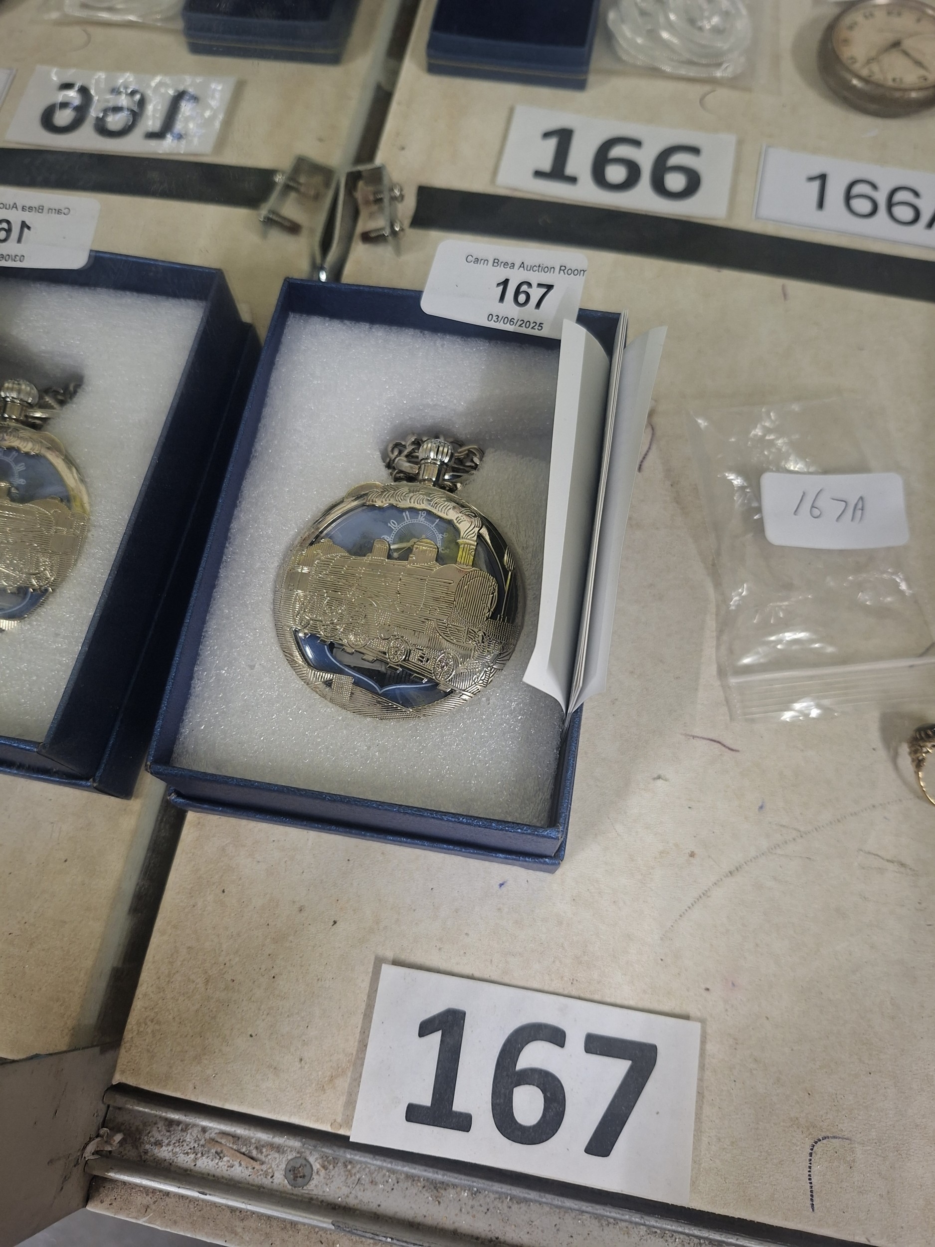 Silver pocket watch featuring a steam locomotive design, with chain, in navy blue box.