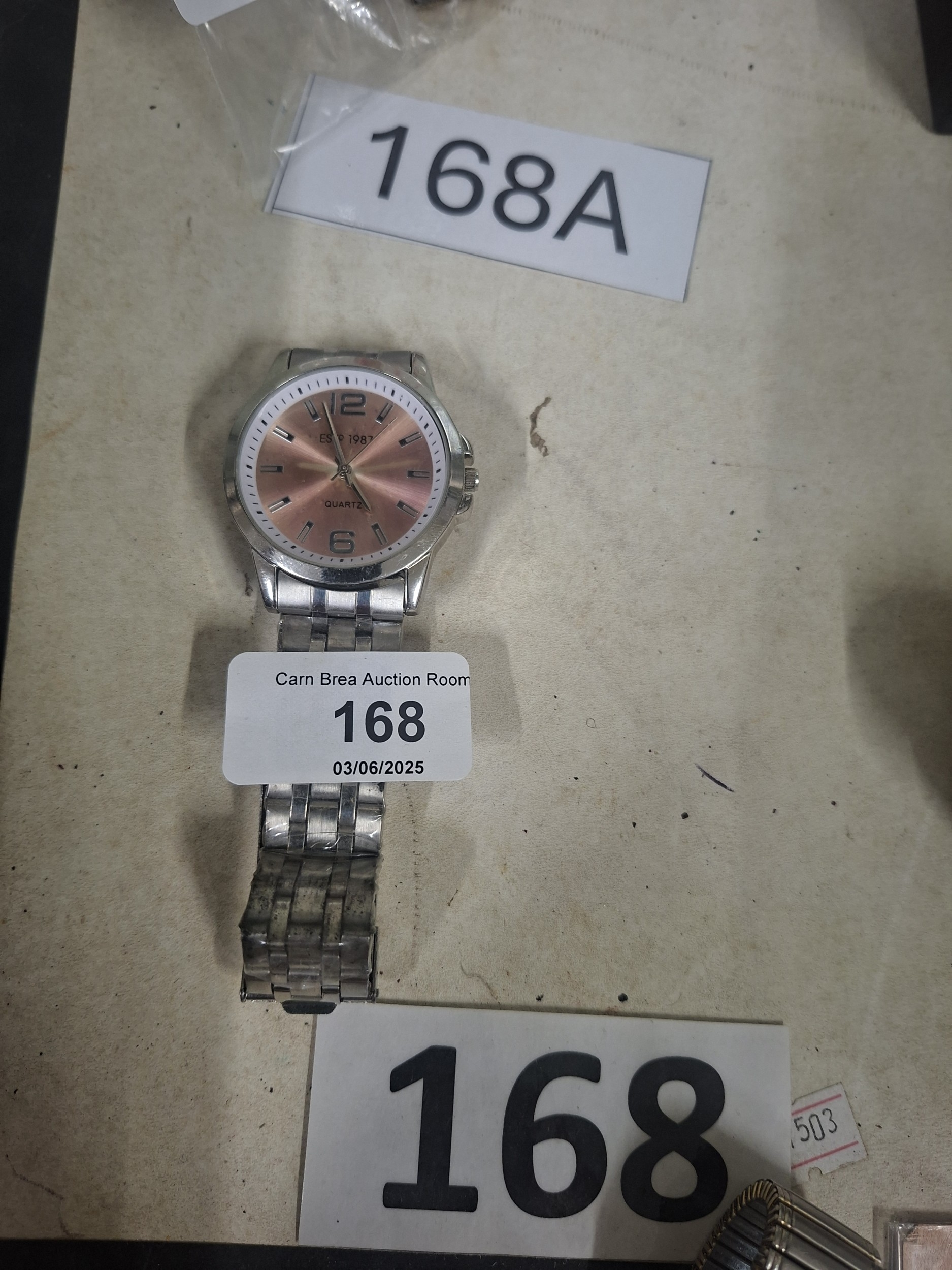 Silver tone wristwatch with rose gold face, Roman numerals, and “EST 1987” marking.
