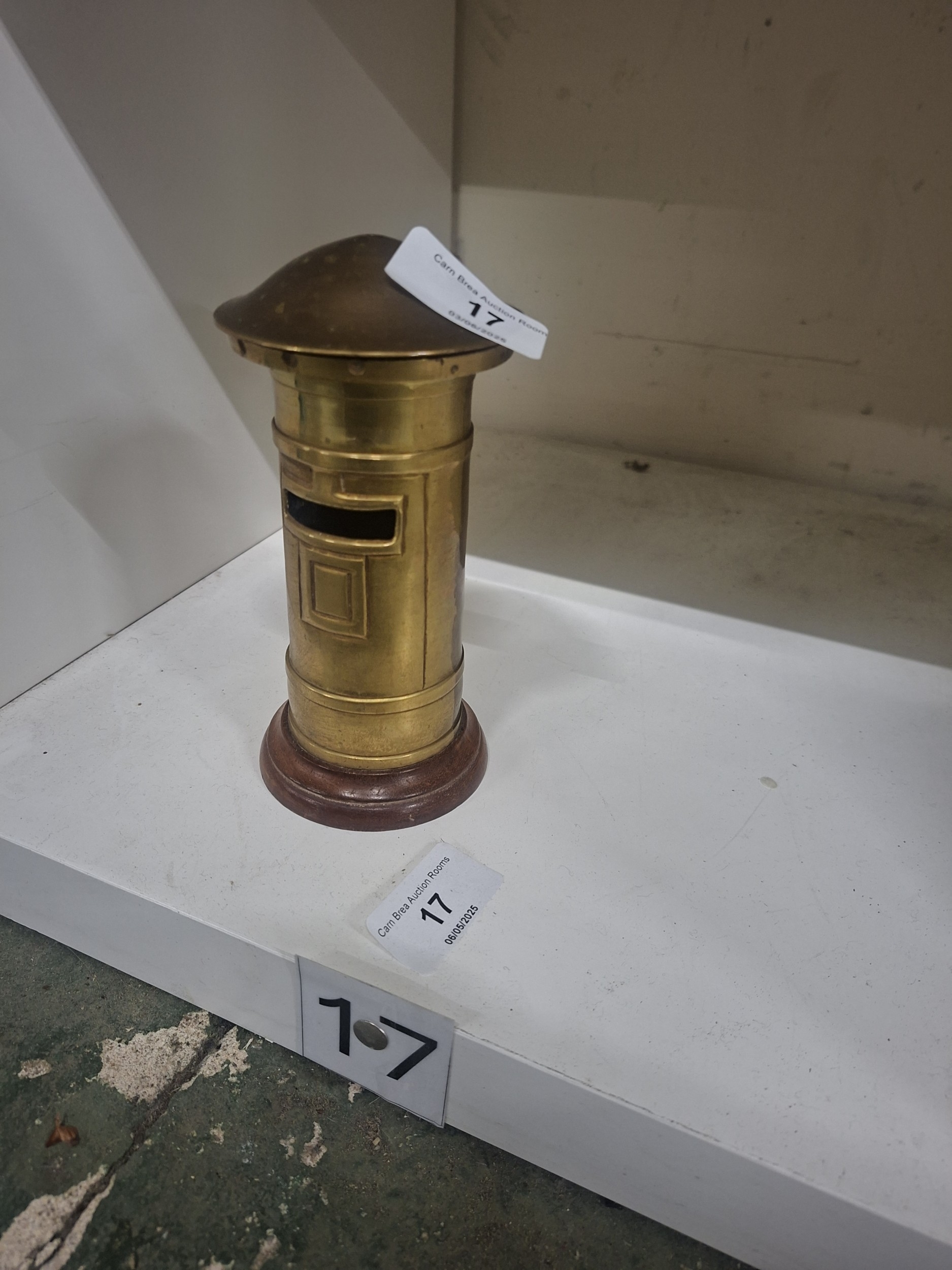 Small brass post box model with wood base showing signs of wear.