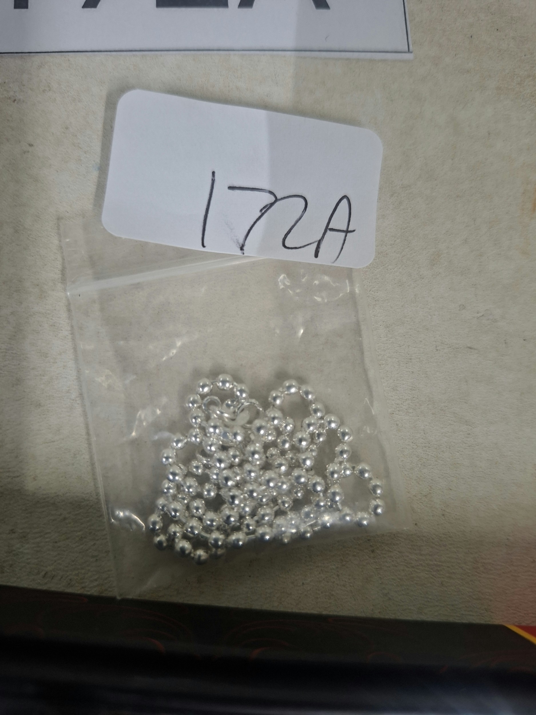 A silver-colored beaded chain is sealed inside a clear plastic bag.