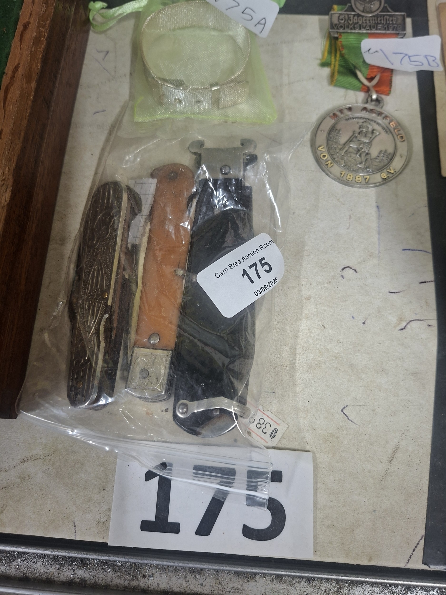 Lot includes three used pocketknives with varying handles and a metal bracelet.